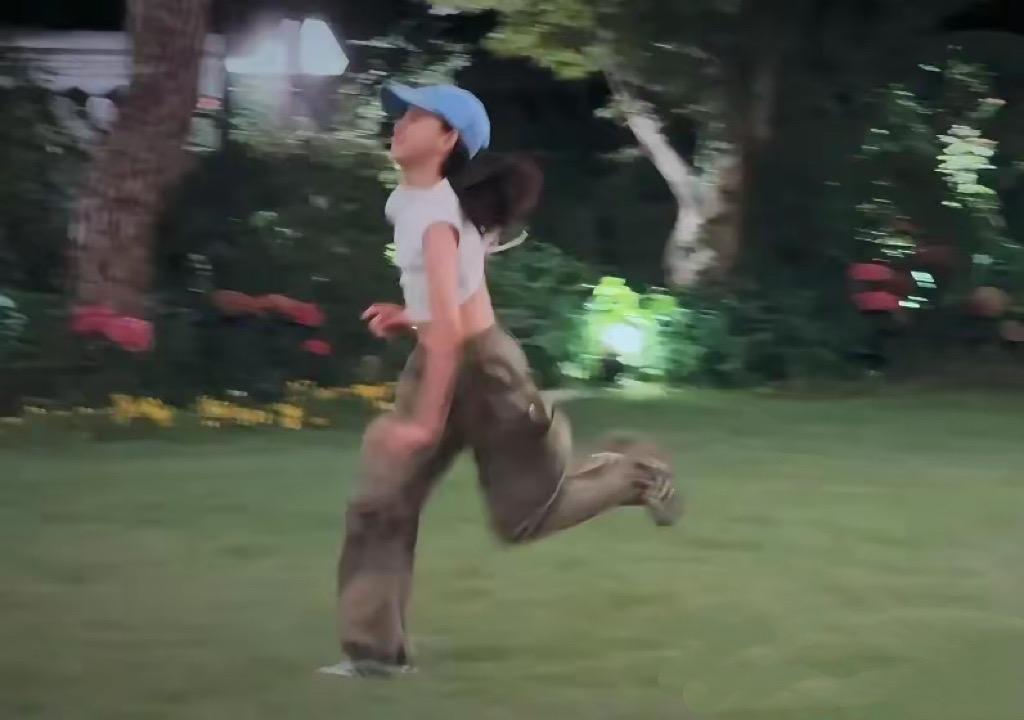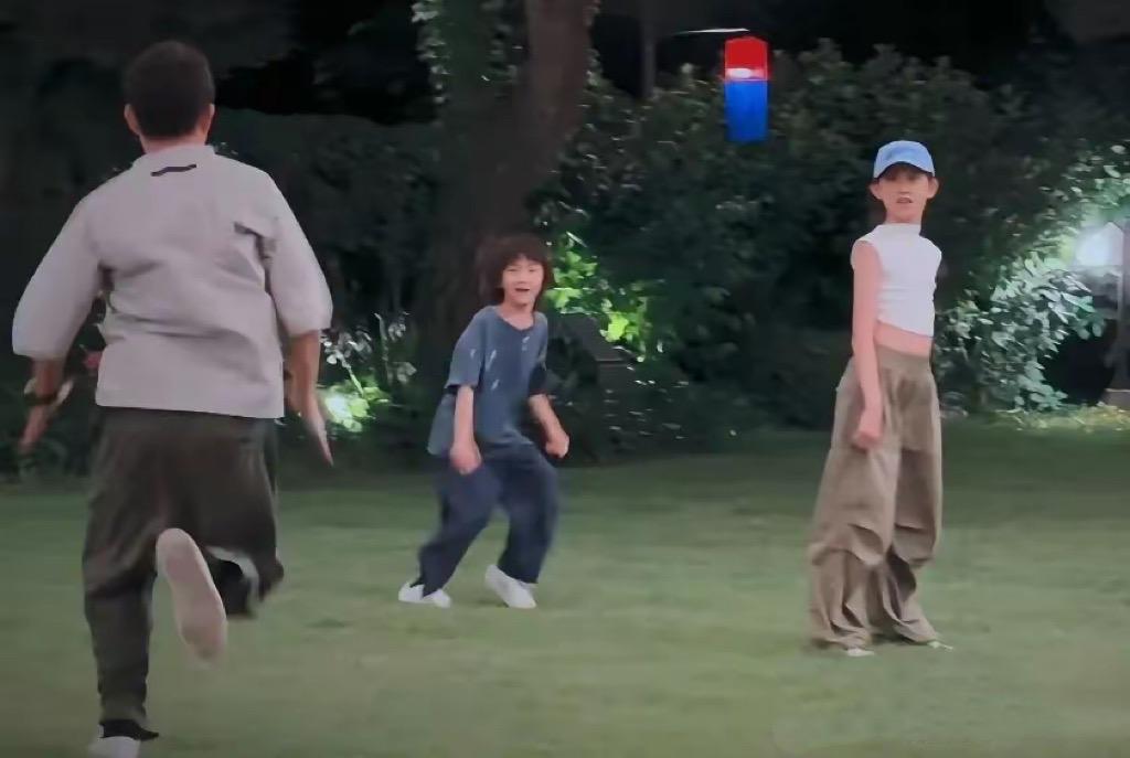 黃磊和孫莉的幾個孩子在草地上奔跑,盡情的玩了。二女兒穿着小背心、工裝風闊腿褲、戴着棒球帽,也是又甜又酷。