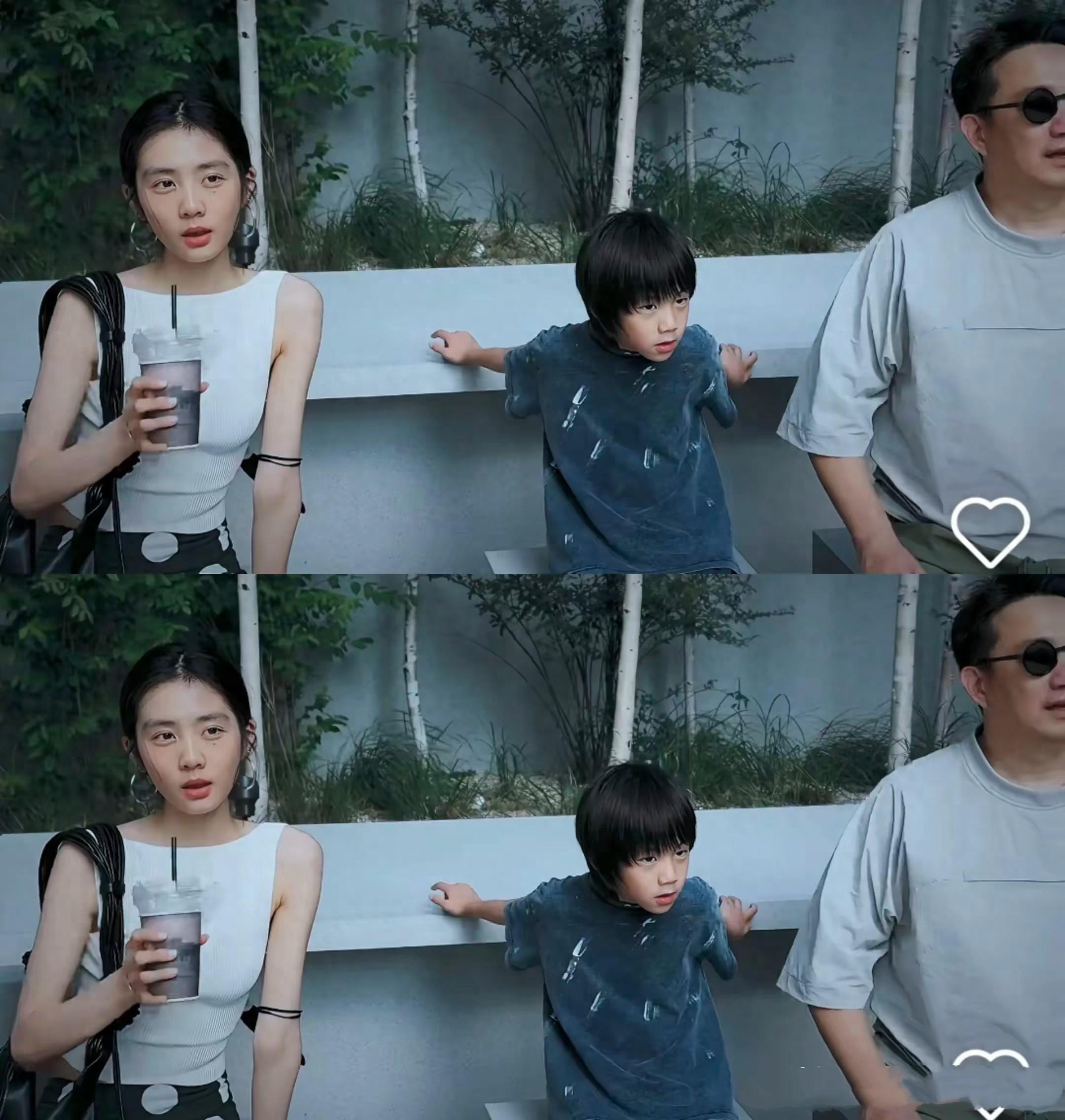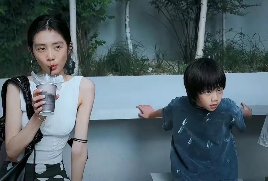 黃磊帶着三胎兒子和黃多多一起出現在鏡頭裏,黃多多穿了一件修身的小背心、喝着奶茶,她又白又瘦的非常有明星氣質。