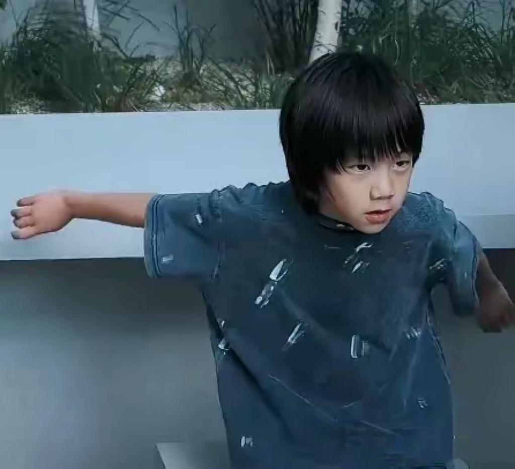 黃磊的兒子,穿的又潮又酷。雖然兒子年齡小,但一看這長相就是隨爸爸。單眼皮、小眼睛,頭髮也挺長。