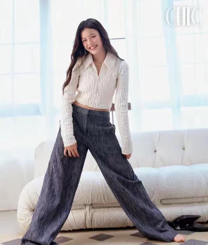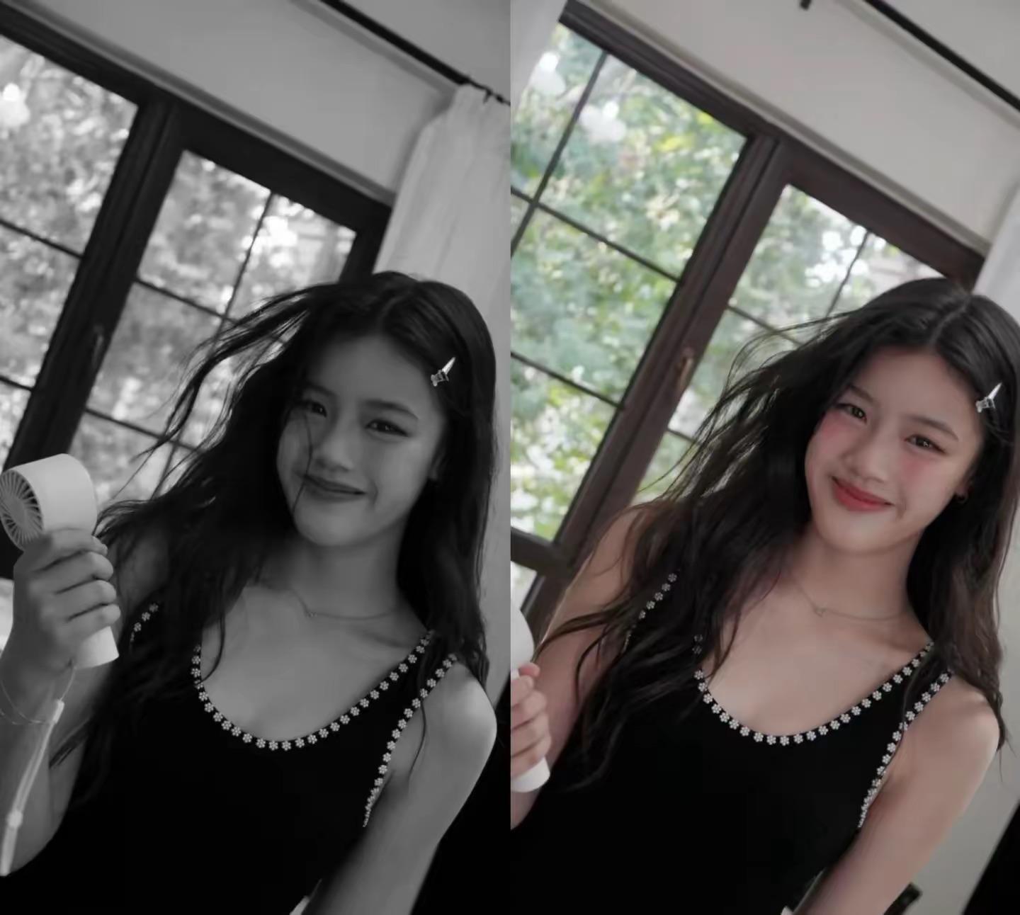 Hanni長了一張很大氣的方形臉,五官立體深邃。穿着黑色背心裙、長髮披肩的樣子青春又活力。這樣的女孩子,未來進娛樂圈前途不可限量。