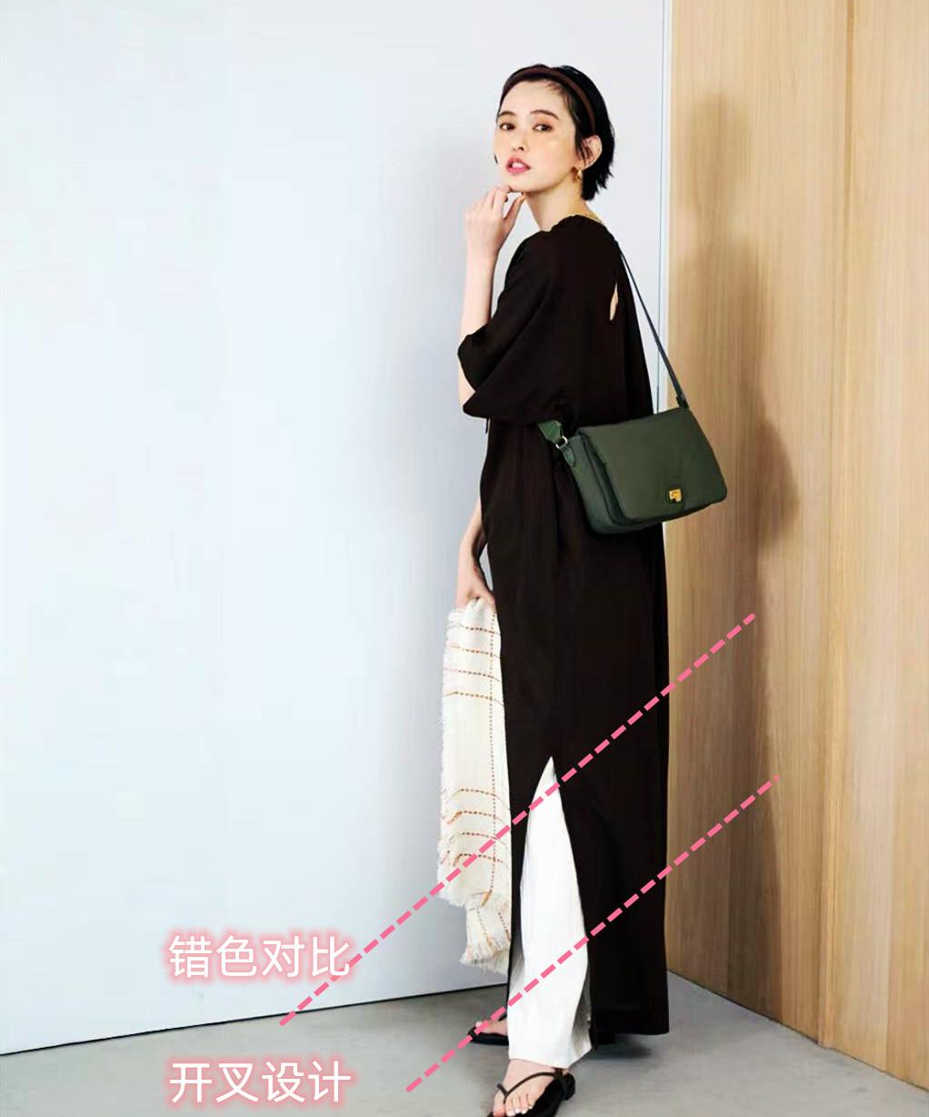 從位置來看,側開叉是日系連衣裙的經典選擇。長度多在膝蓋上 5cm 至膝蓋下 10cm 之間:短開叉(膝蓋上)在行走時露出小腿線條,爲寬鬆版型的連衣裙增添靈動感,適合搭配帆布小白鞋,強化青春感;長開叉(膝蓋下)則在邁步時展現大腿後側的柔和曲線,配合收腰設計,可平衡 H 型連衣裙的直線條,適合通勤場景搭配低跟樂福鞋。