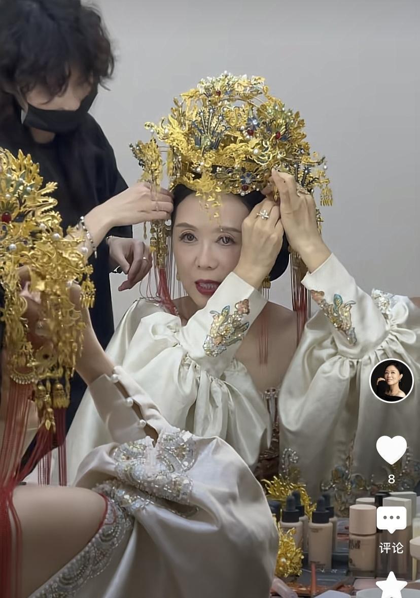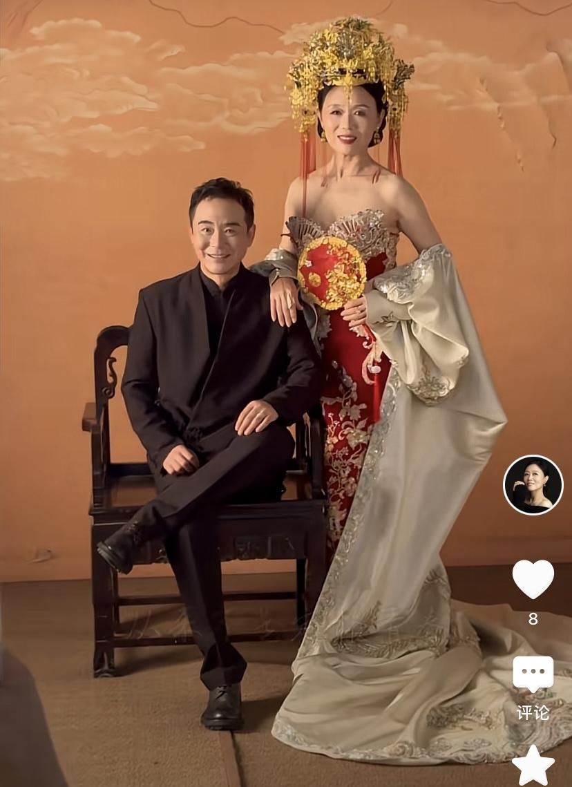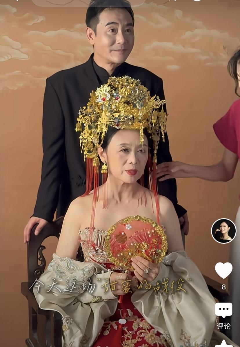 吳瓊穿着抹胸款的紅色中式禮服,頭戴華麗的金色鳳冠,有一種美嬌娘的感覺。別看她63歲了,依然風韻猶存,簡直比小15歲的老公還顯嫩。