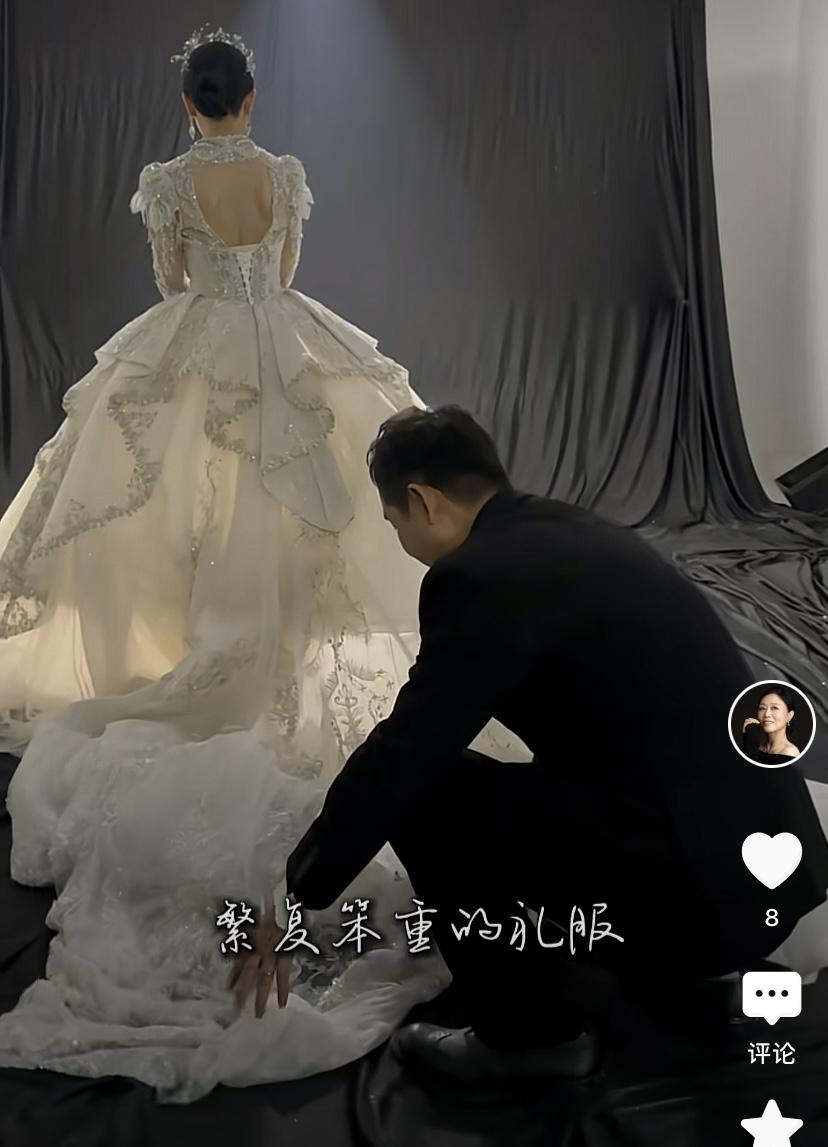 第一套華麗的白紗,裙襬的拖尾設計也很獨特。有大大的裙撐、拖尾的裙襬。爲了拍出更好看的效果,阮巡蹲在地上給老婆整理白紗,真是太細心了。