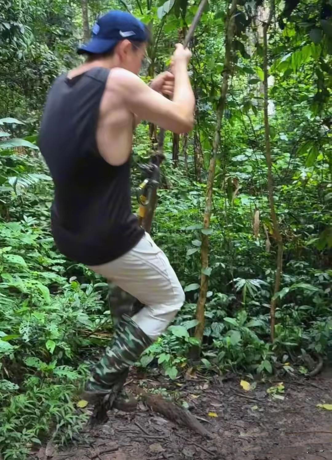 在叢林裏探險,還是要多做一點防護措施。不過看張馨予和何捷,最大的防護措施就是給自己穿了雨靴。