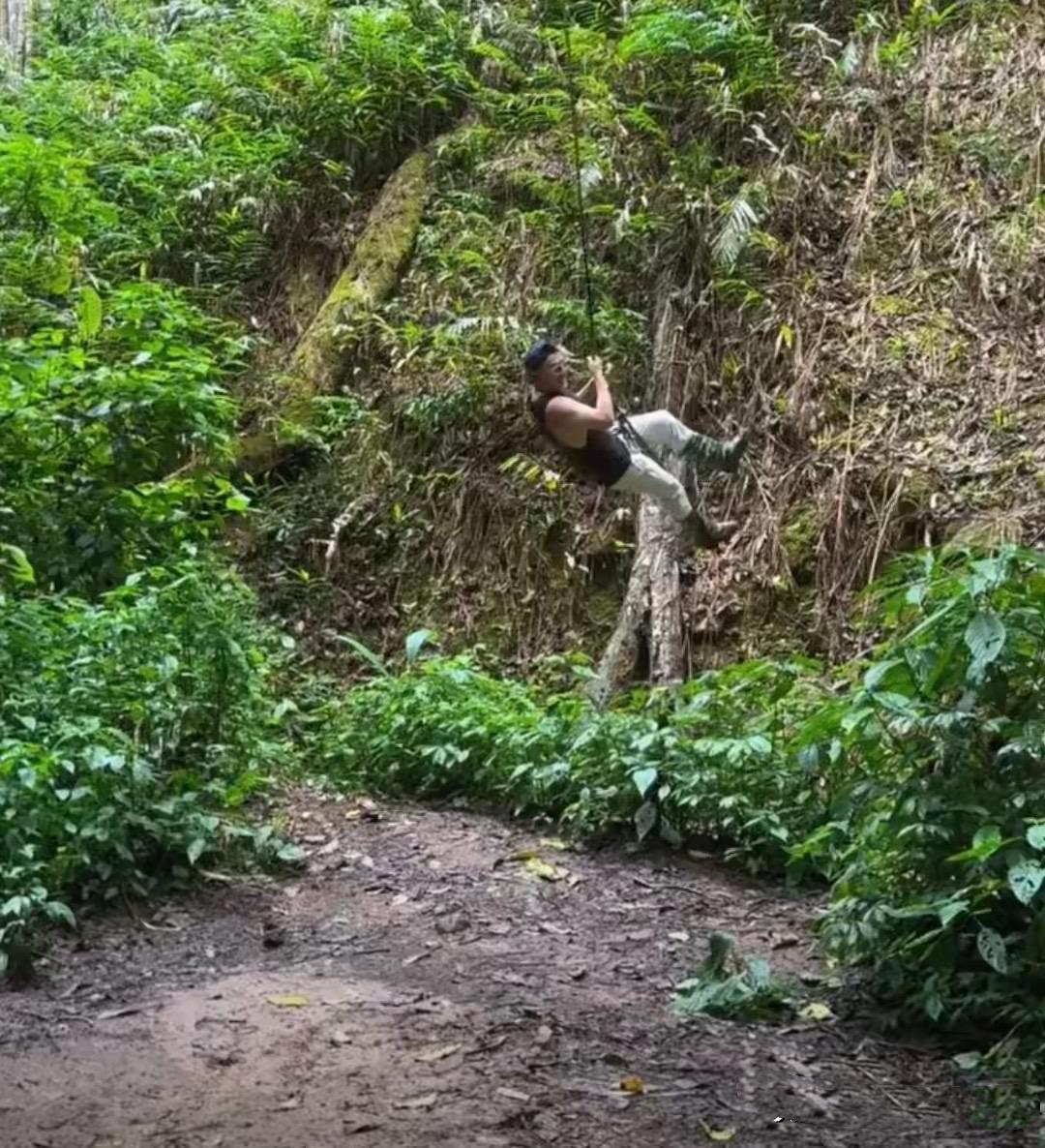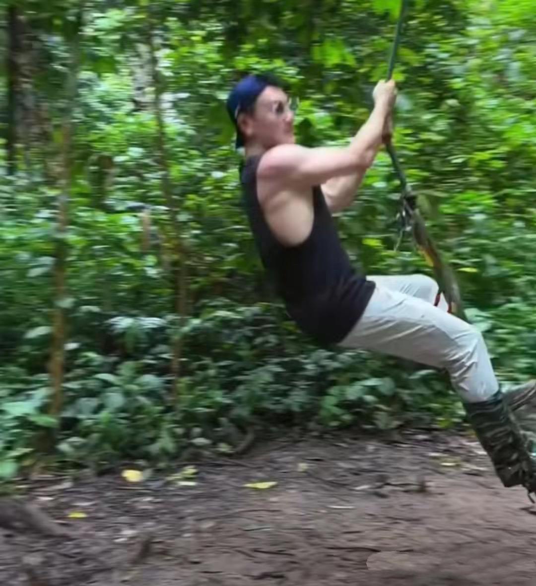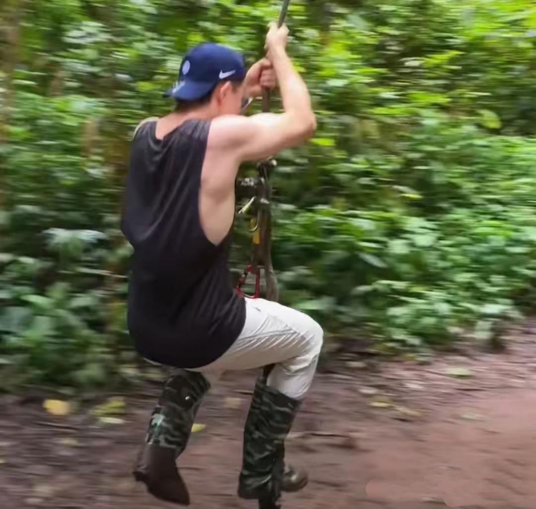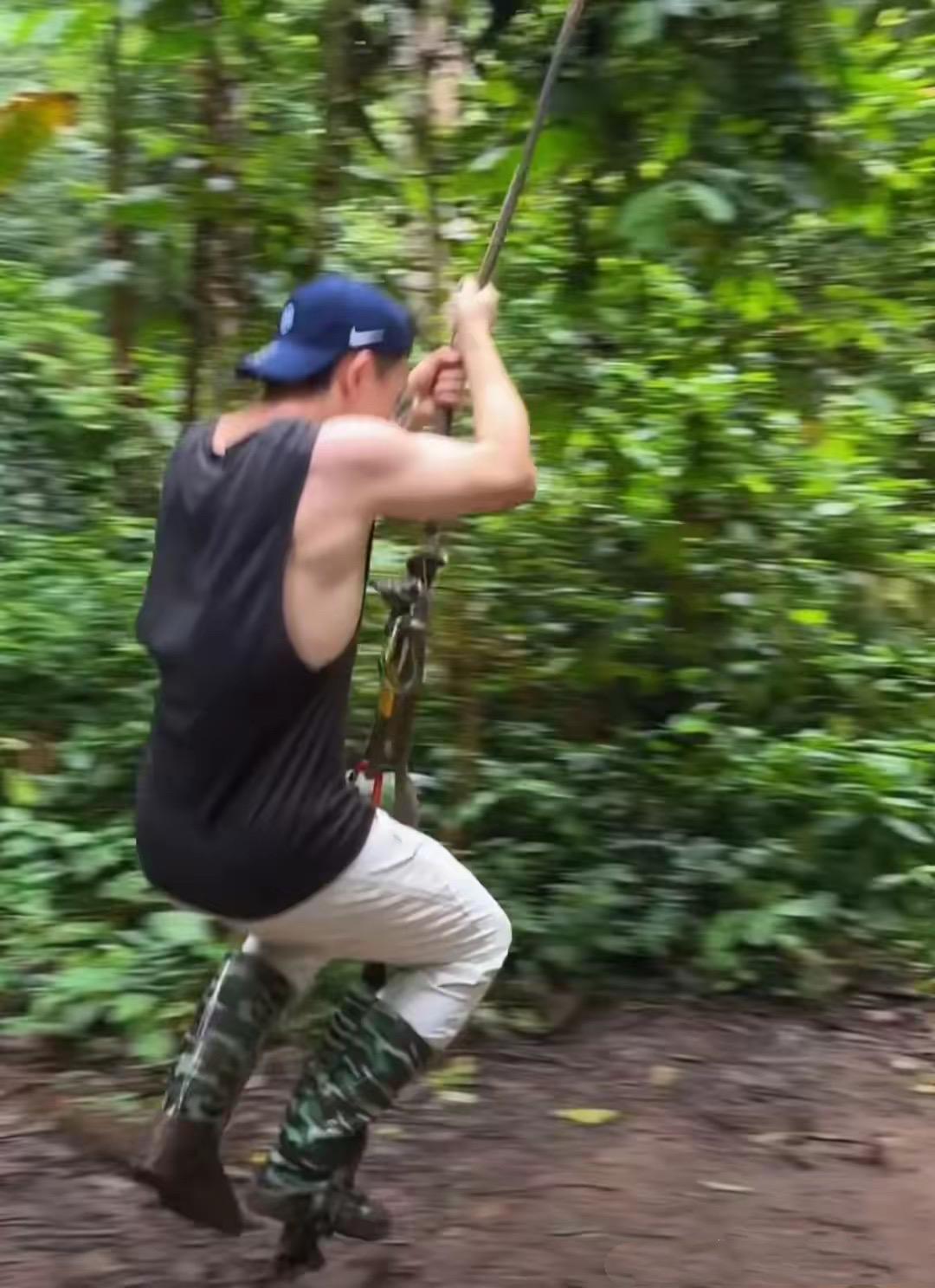 他抓着繩索盪來盪去,一身腱子肉好帥氣。當天爲了行動方便,何捷只穿了一件寬鬆的跨欄背心、配了米白色褲子,還穿了雨靴,