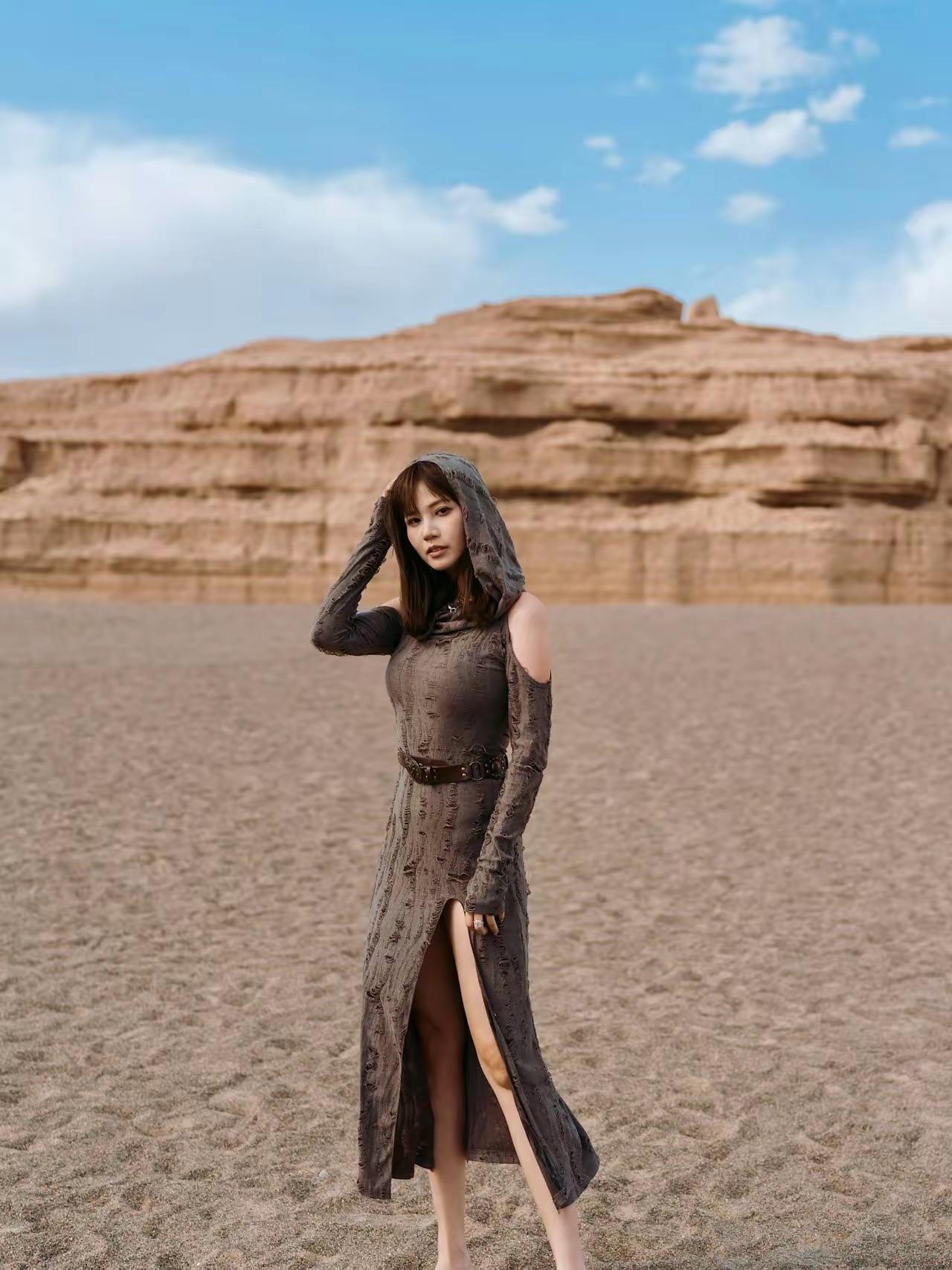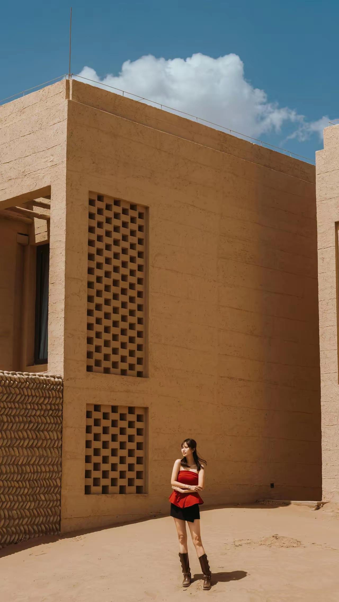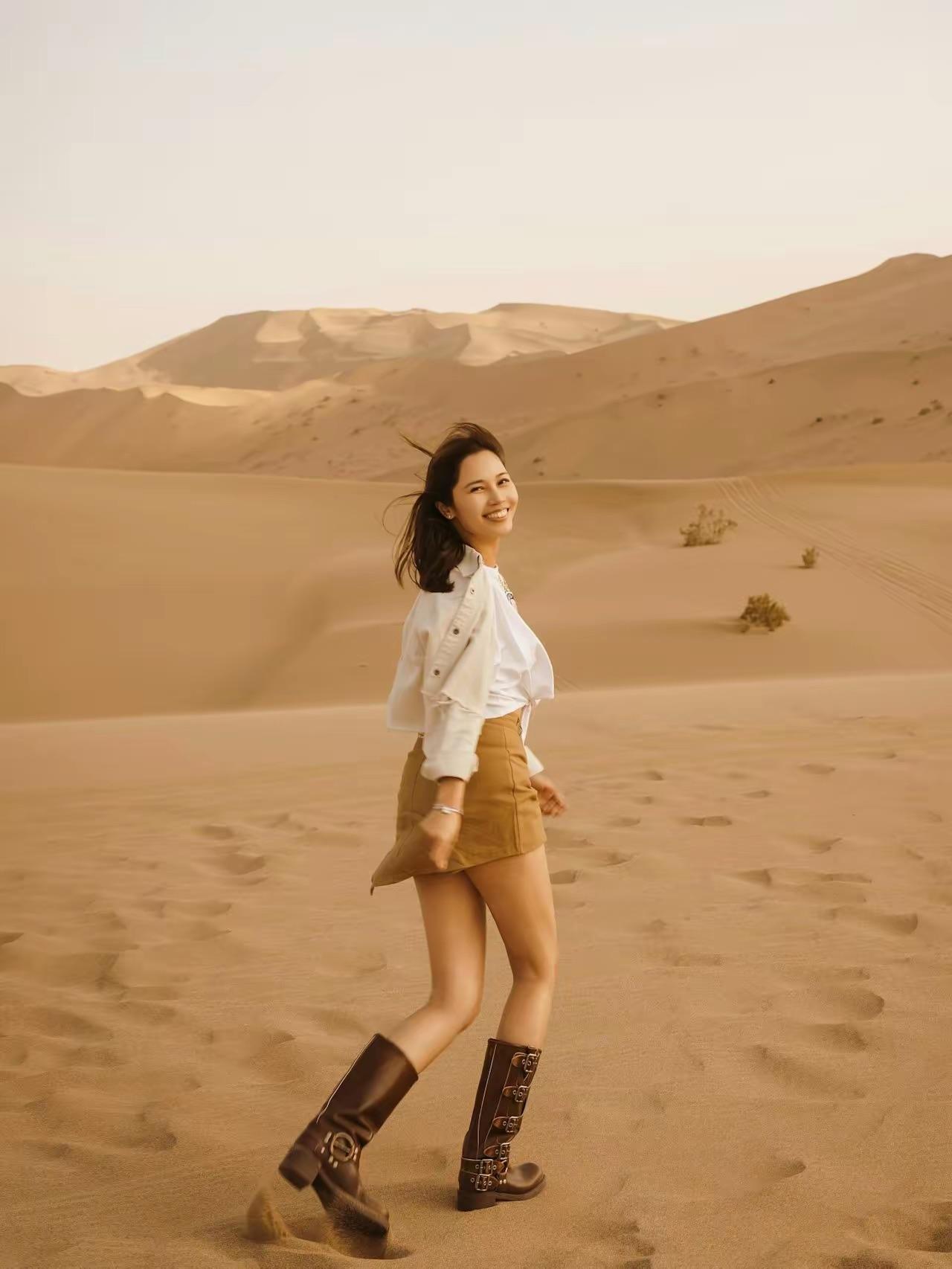 只要走出這個酒店,就可以在沙漠中拍美照。不必去人擠人的景點,這裏可以拍到更加壯觀的美照,彷彿置身於廣袤無際的沙漠之中,鏡頭下的岑潔儀又美又颯。