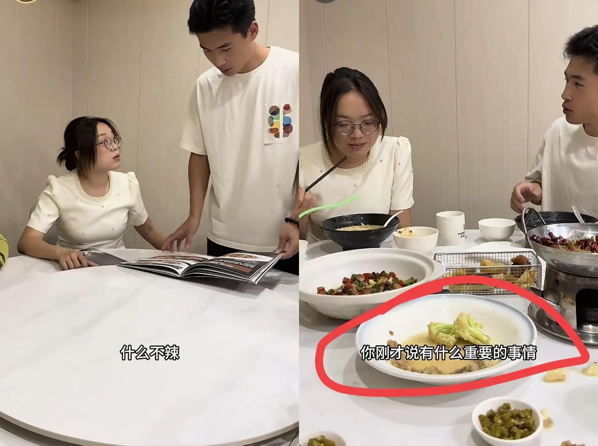 飯桌上,大妹請海軍哥哥點菜,還特意問了什麼不辣,專門點了不辣的菜。喫飯的間隙,海軍就問大妹有什麼重要的事情?