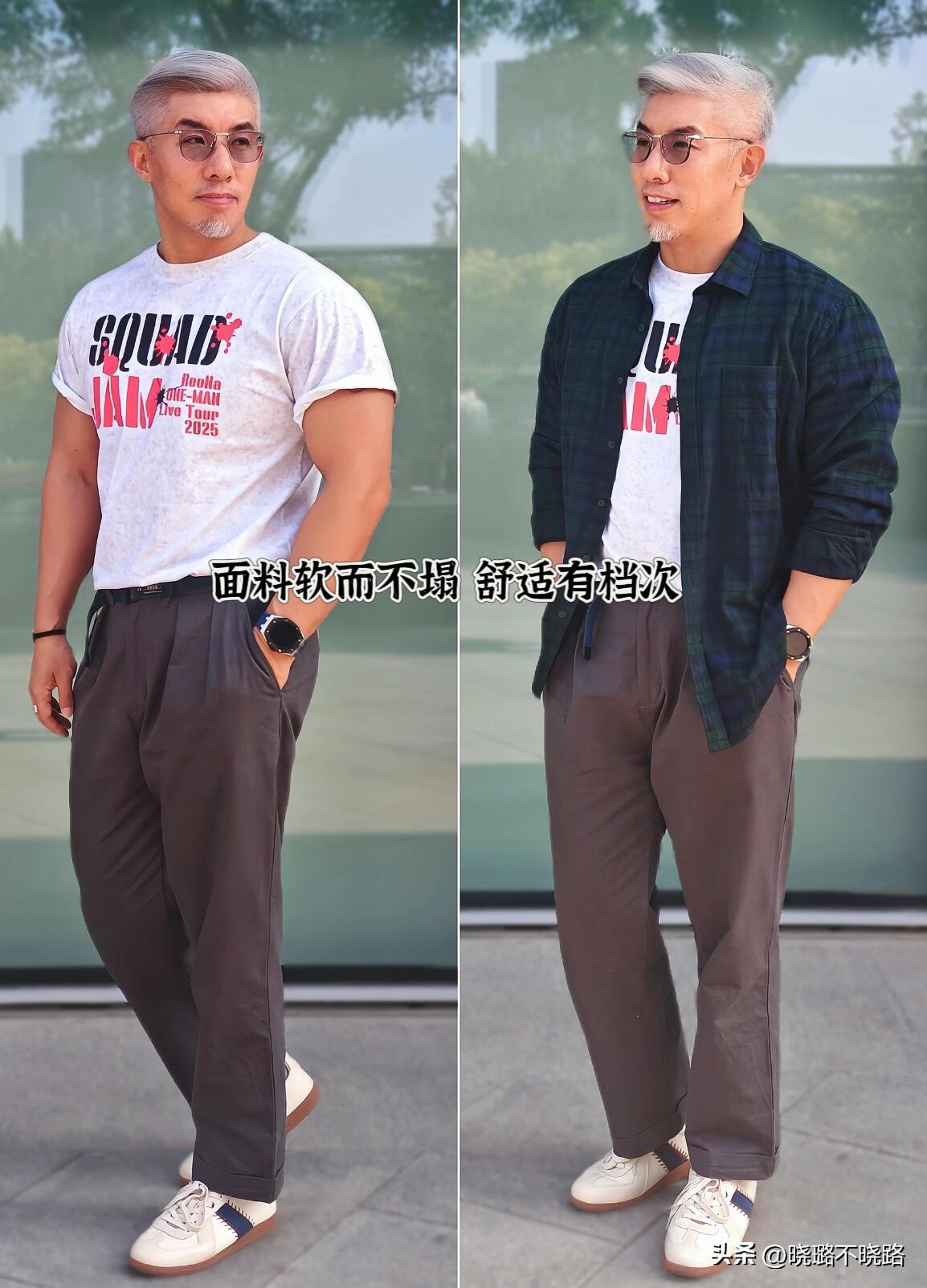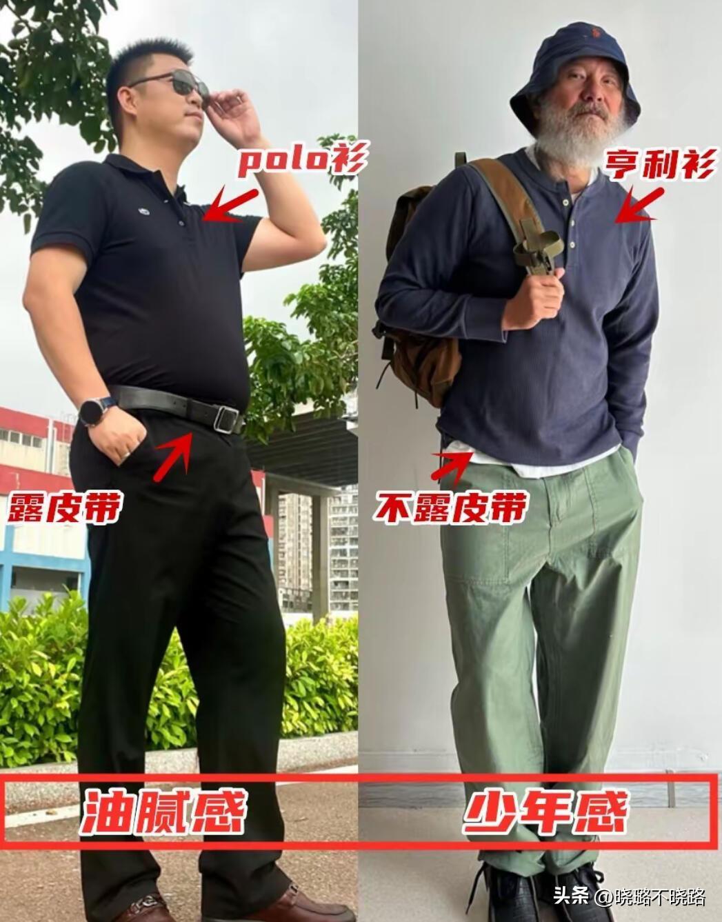 不知道大家有沒有發現一個現象,那就是很多男人到了中年,特別喜歡將衣襬塞進褲腰裏,這種算法有很大的“隱患”,不僅會暴露大肚腩,還特別油膩沒品位,建議大家可以露出衣襬穿,舒適又自然。