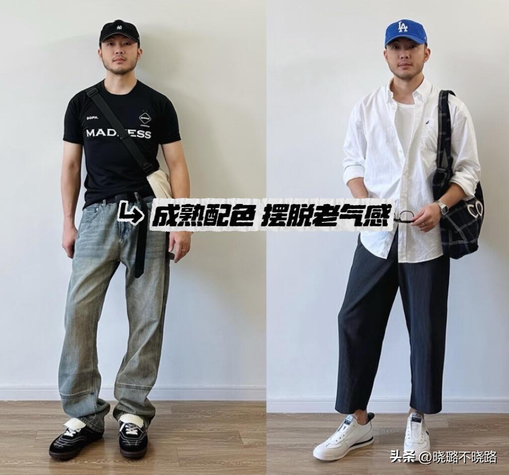尤其是T恤和休閒褲的組合,建議可以利用帽子和包包“加分”,小量感的時尚款斜挎包,可以遮住大肚腩,豐富上半身,鴨舌帽則可以輕鬆凹造型。