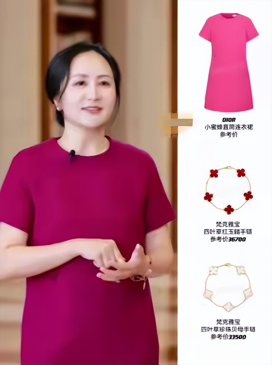 孟晚舟穿的玫紅色連衣裙,款式非常簡單。搭配梵克雅寶的紅玉髓手鍊,就彰顯着貴氣。