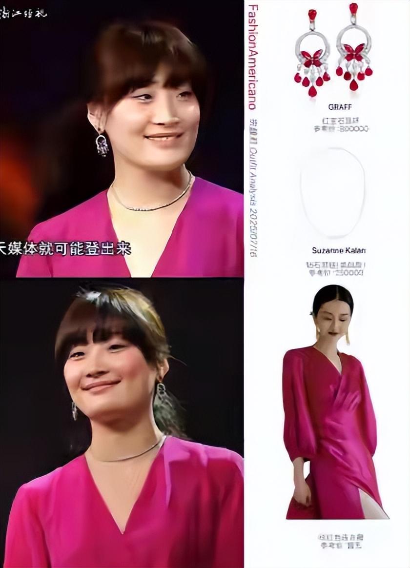 在看宗馥莉,她穿衣大膽張揚。畢竟年輕10歲,在衣着打扮上也有更多發揮空間。大膽的多巴胺配色,華麗的紅寶石耳環,都不足以襯托她的貴氣。