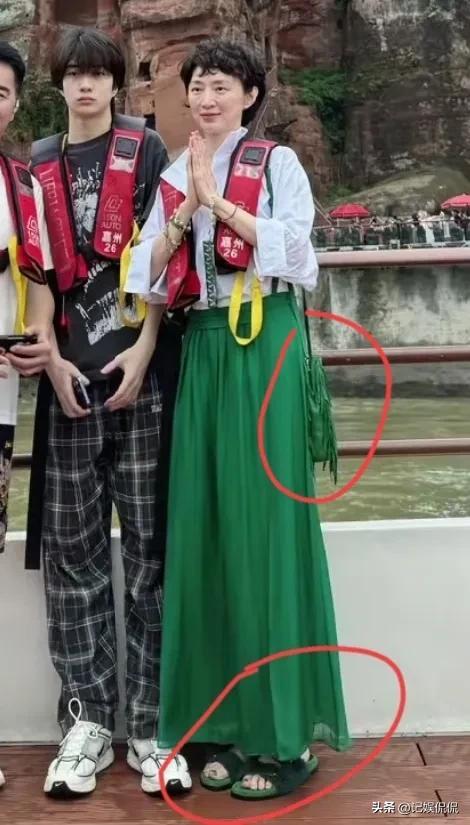 下身是高腰綠色褶皺裙,裙長及膝,褶皺從腰線散開,瞬間拉長腿部比例,配合高腰設計,讓 170cm 的她更顯高挑。一旁 16 歲的兒子已高出許亞軍半個頭,遺傳了母親的白皙皮膚,穿簡單的白色 T 恤與深色長褲,站姿挺拔,眉眼間有張澍的靈動。