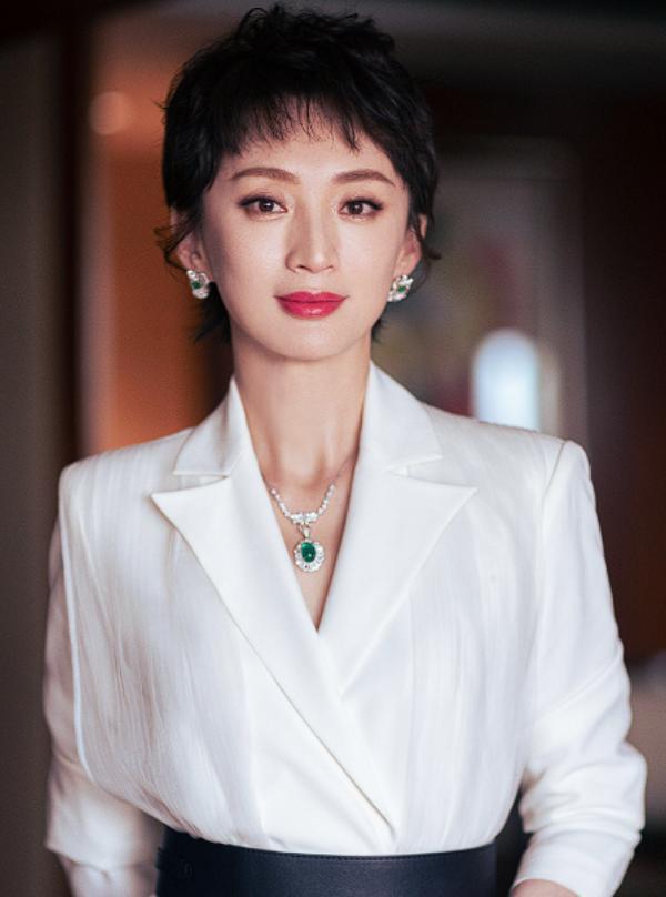 她的短髮長度及肩,燙成自然捲,髮尾外翹,既顯利落又添幾分嬌憨,配合她的鵝蛋臉,弱化了 “骨感” 的凌厲。這種髮型對職場女性尤其友好,搭配襯衫或 T 恤都能切換風格 —— 穿白色緞面襯衫時,短髮別在耳後露出耳環,是 “知性姐姐”;穿印花 T 恤時,髮絲凌亂幾分,又成了“靈動少女”。