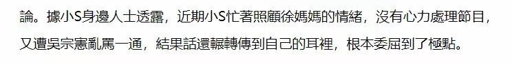 據小S身邊的人透露,當吳宗憲痛罵小S的時候,她正忙着照顧徐媽媽黃春梅。本來就沒有心力處理節目,又被吳宗憲一頓炮轟,結果這些話還傳到自己耳朵裏,真是委屈到了極點。