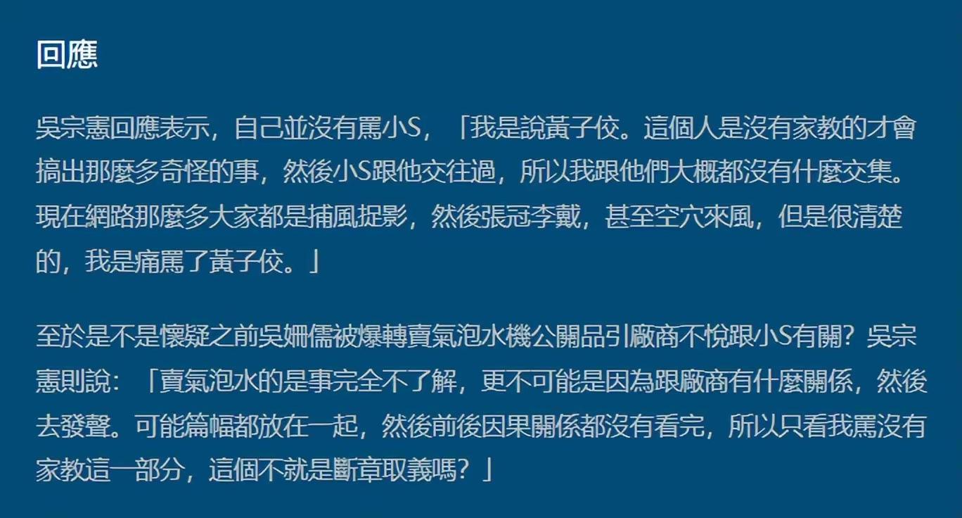 也難怪,先下小S不願意和吳姍儒同臺,而吳宗憲爲了女兒也又一次改口。表示自己的沒有罵大小S,說的是“黃子佼”。是大衆斷章取義了,甚至出現了捕風捉影、張冠李戴、空穴來風的消息……