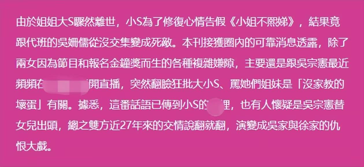 可吳宗憲的“翻臉”,終歸是因爲被觸及的利益。當時吳宗憲的女兒代班《小姐不熙娣》,本來就是替小S頂班。