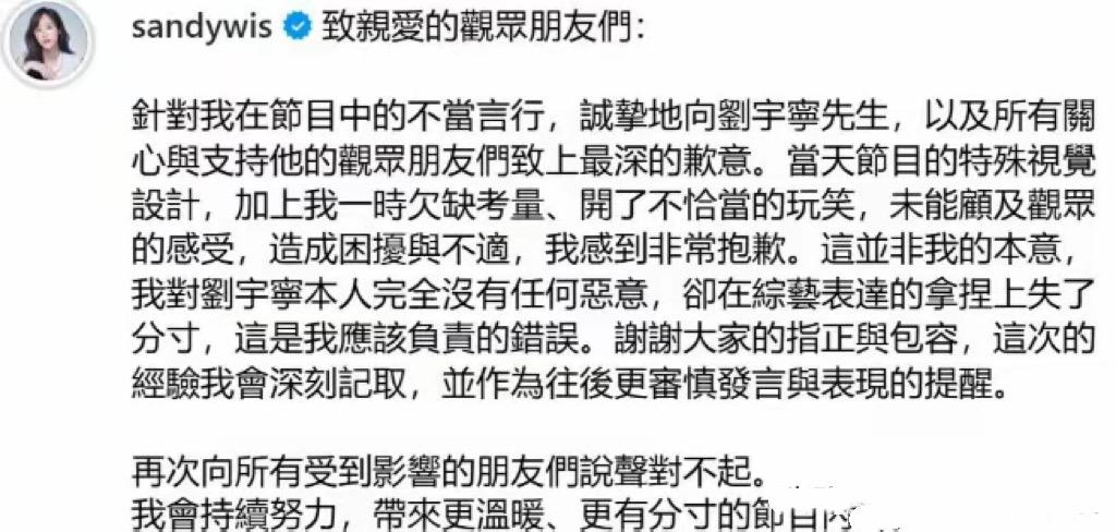 吳姍儒言辭懇切的道歉,她說當天節目的特殊視覺設計,加上自己一時欠考量,開了不恰當的玩笑,未能顧及觀衆的感受,感到非常抱歉。這並非個人本意,且對劉宇寧本人沒有任何惡意。