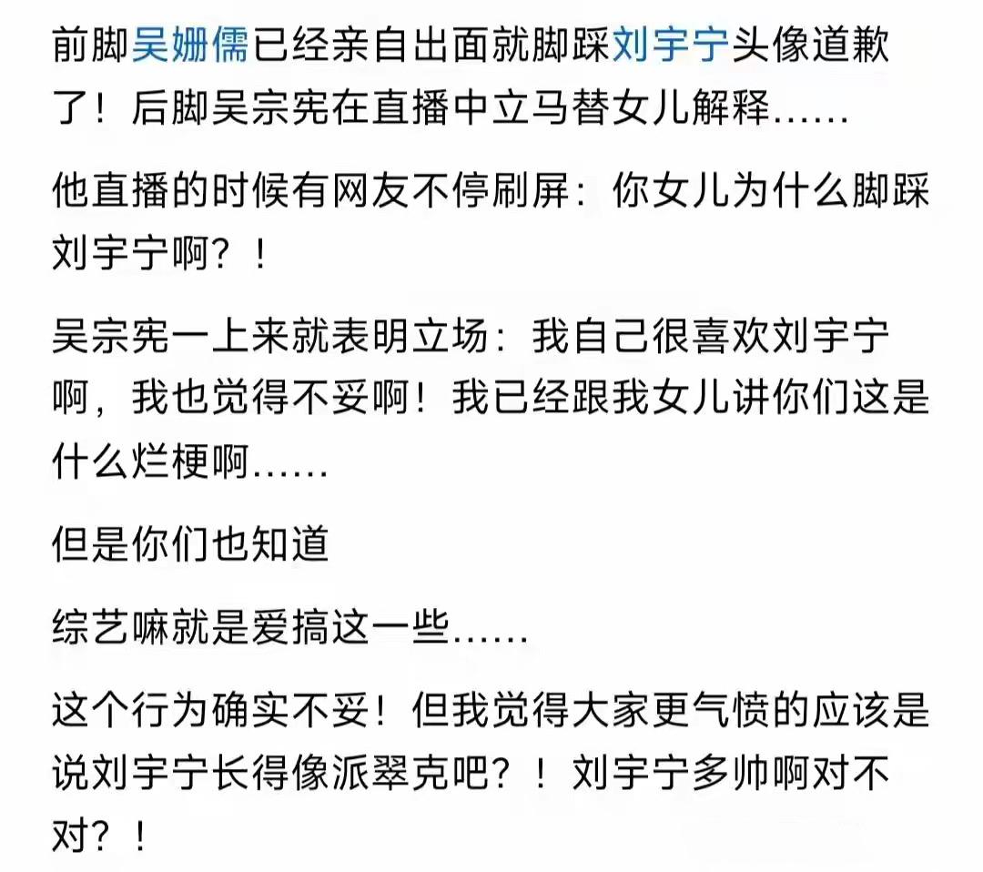女兒被劉宇寧粉絲炮轟,吳宗憲也是急的不行。直播間裏替女兒解釋、維護女兒、也聲明自己很喜歡劉宇寧,且劉宇寧很帥,比派翠克帥多了。