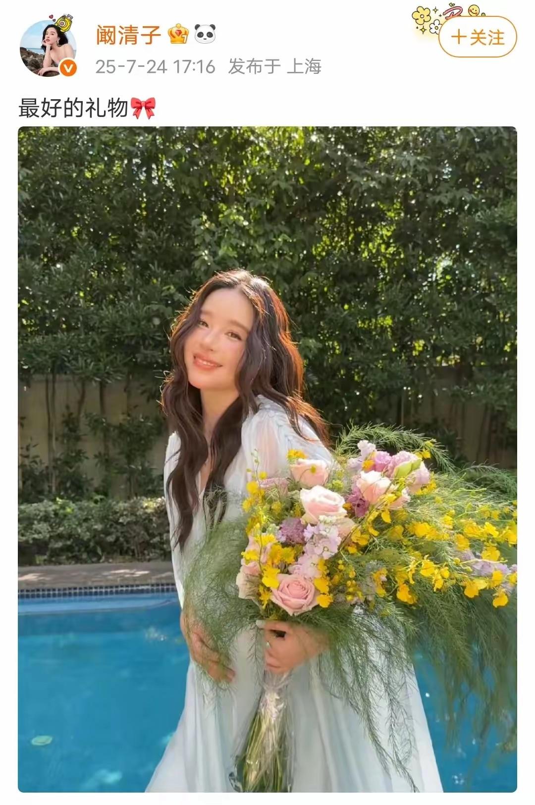 在直播間官宣懷孕後,闞清子就曬出了自己的孕肚照。她捧着一大束鮮花,站在游泳池旁,單手佛撫摸着肚子,滿眼都是母性的光輝,陽光灑下來,顯得她格外溫柔。