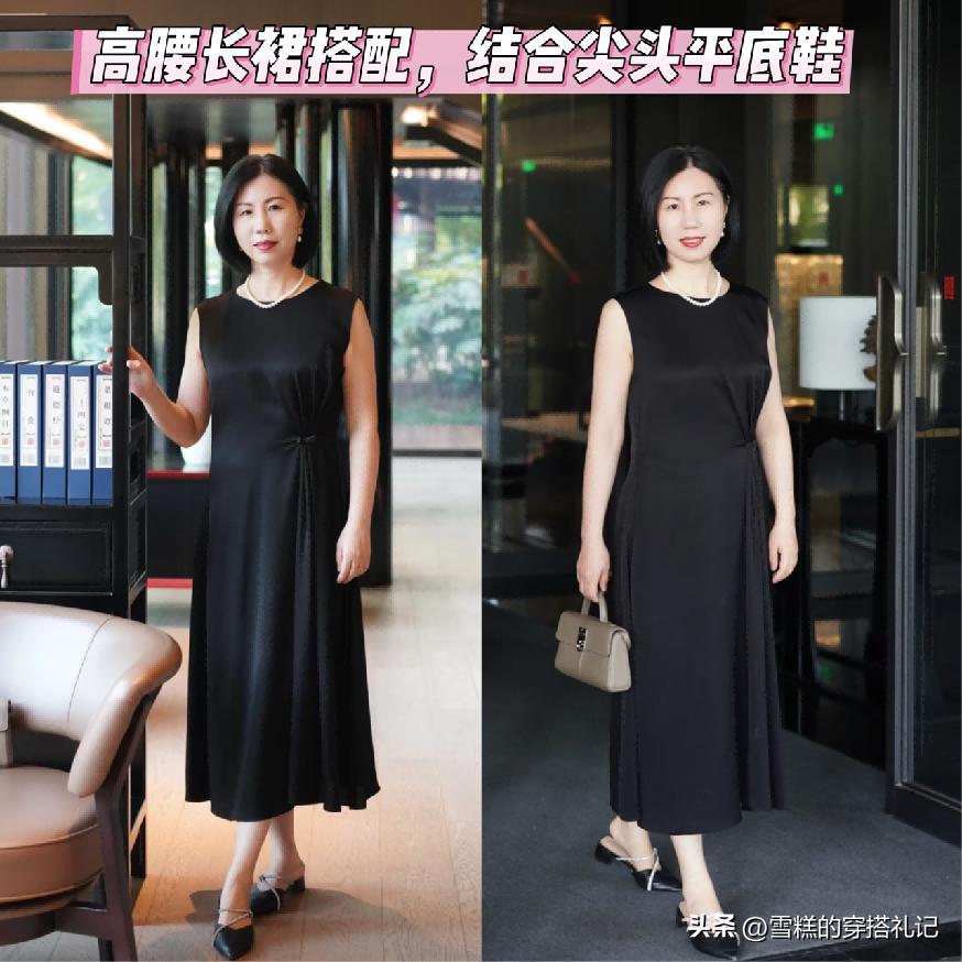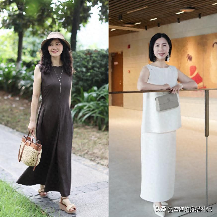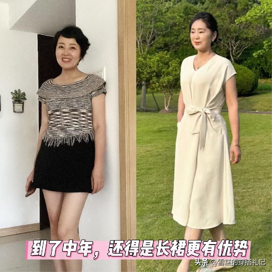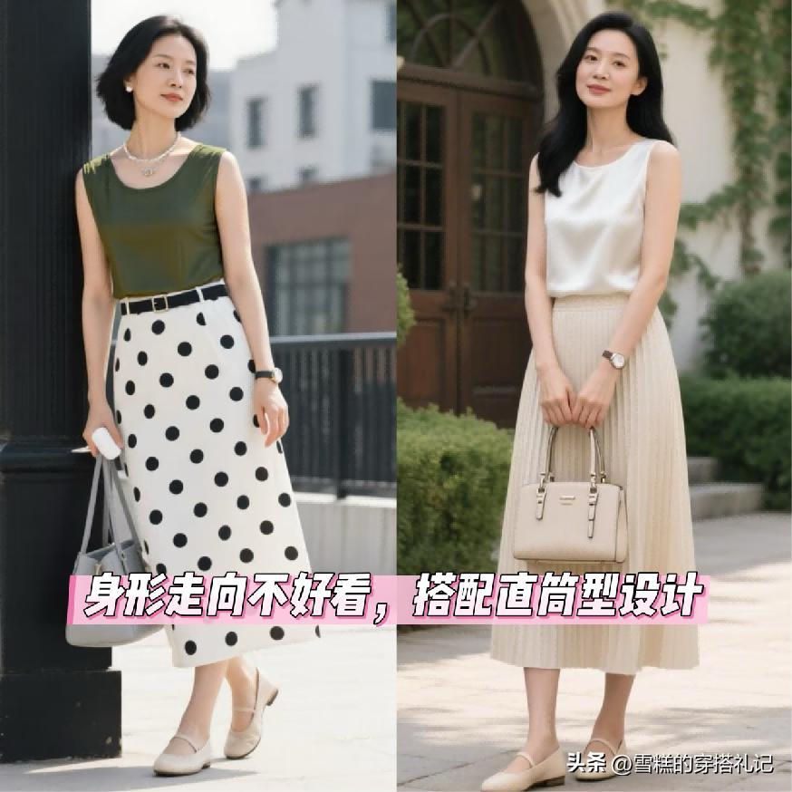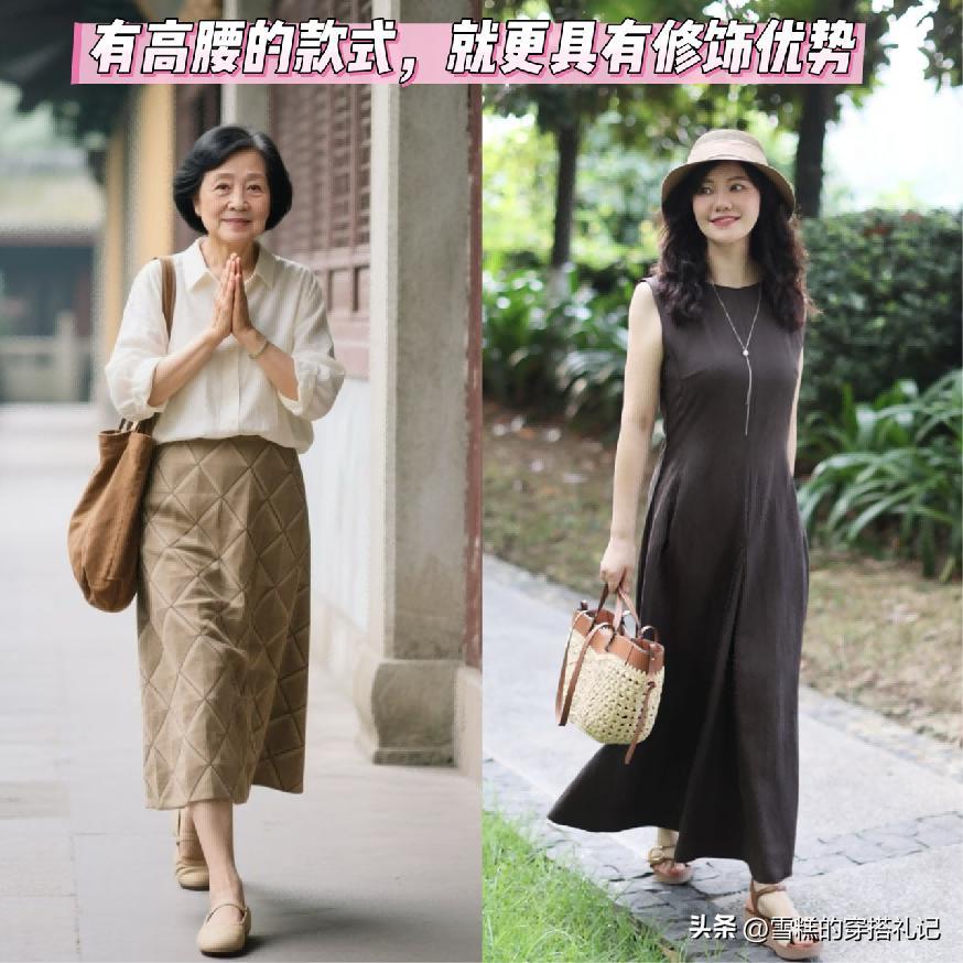 款式就推薦各位女性可以首選自帶高腰的設計,尤其是像連體型的裙裝,一定要在高腰的位置有視覺強調效果,並且它本身的款式狀態是屬於簡約又百搭的類型,例如像傳統的煙管裙又或者是百褶裙, a字型這一類的搭配,在中年階段是最爲適宜的。