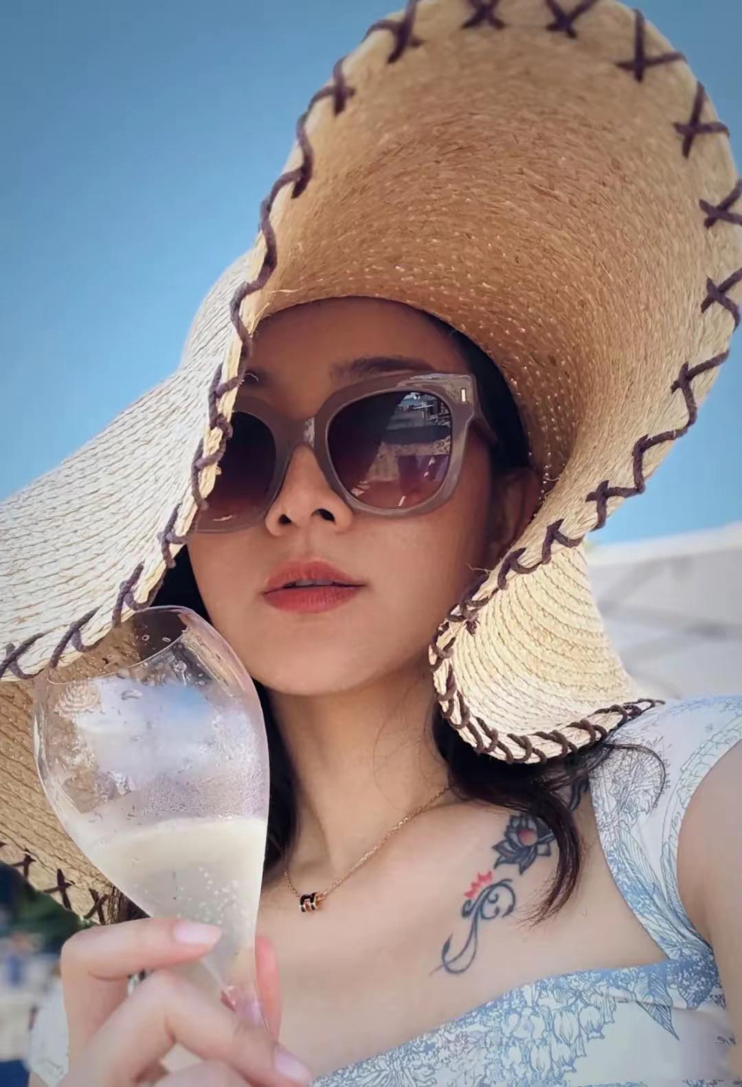 當天的太陽比較熱辣,海面上的紫外線也很強,許婧帶了大檐的遮陽帽,手裏還舉的香檳,倆人的度假生活非常愜意。