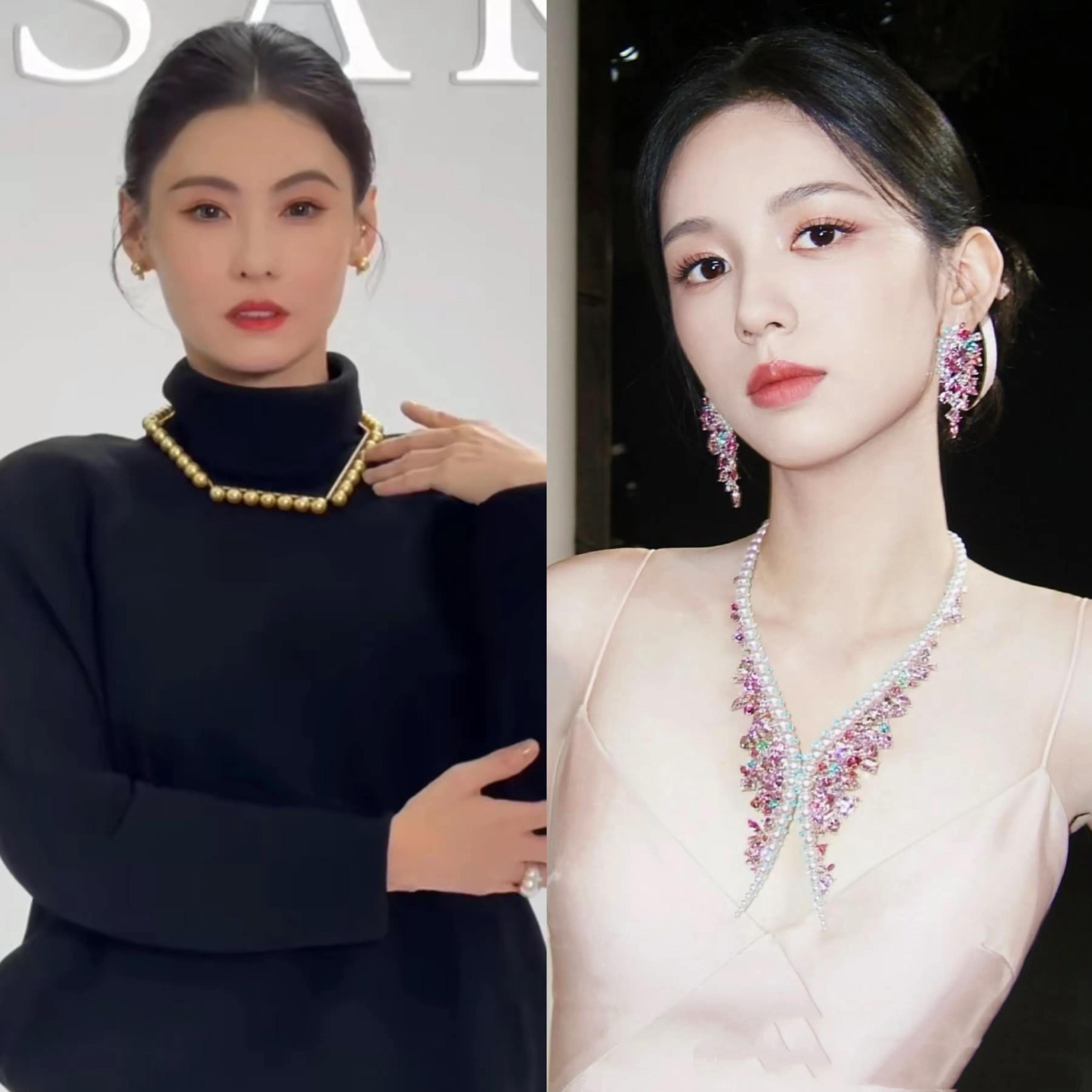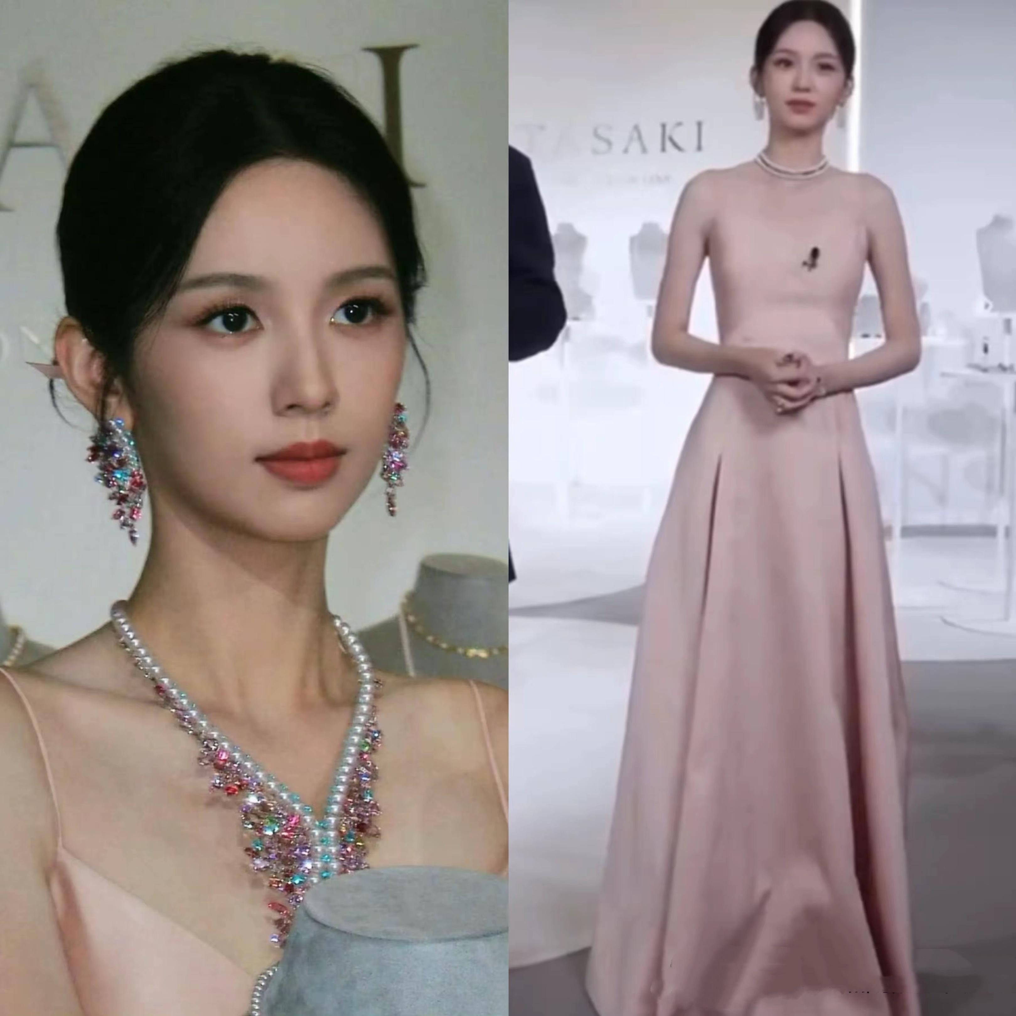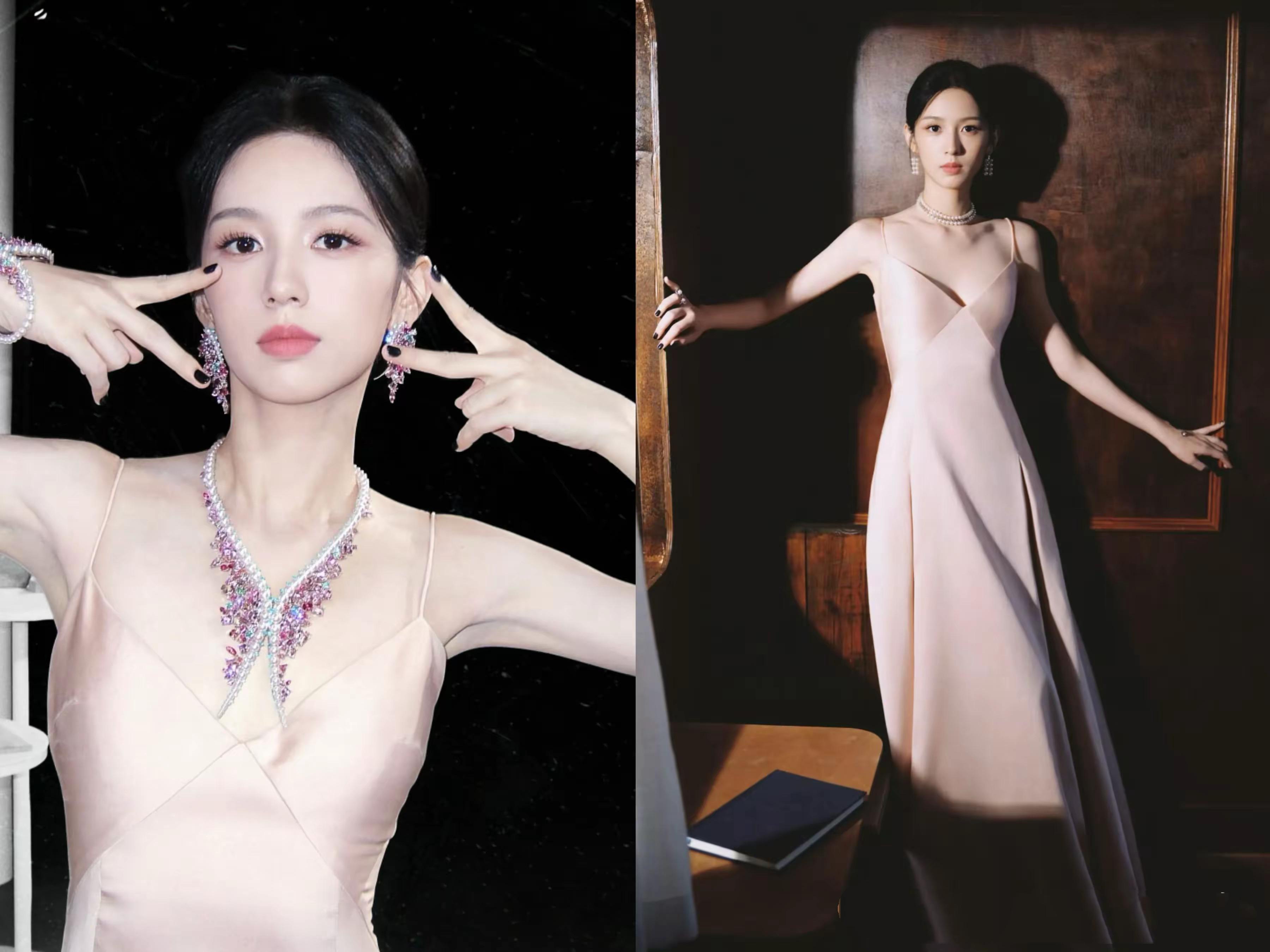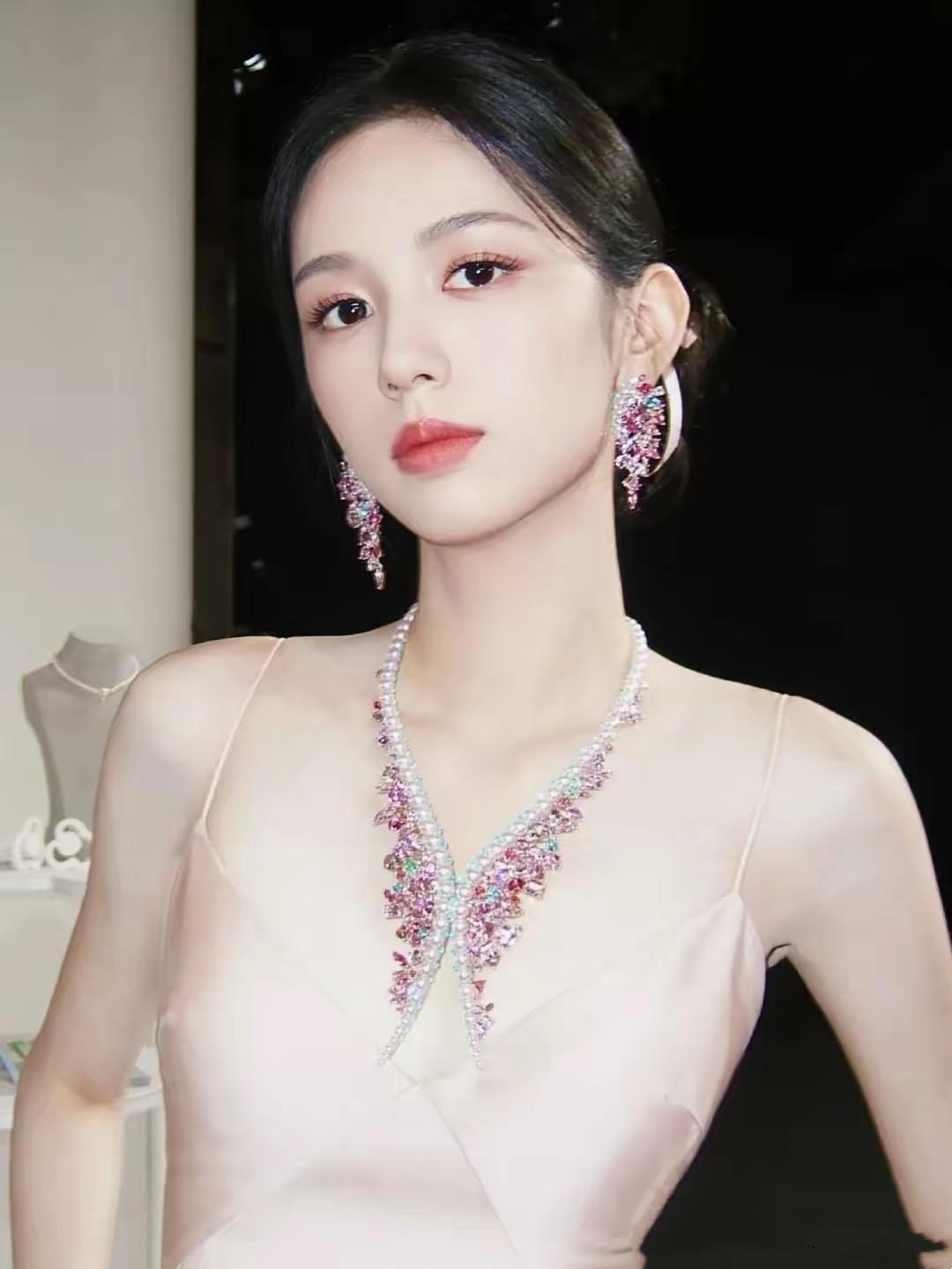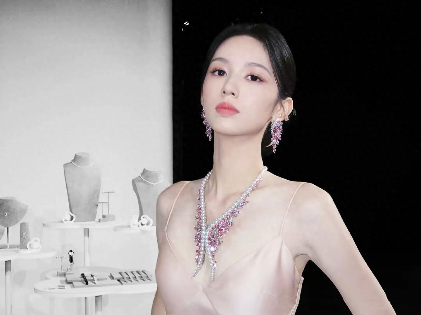 珠寶配美人,一身粉紫色特別適合年輕的周也,在嬌俏中多了幾分端莊、散發着十足的貴氣。