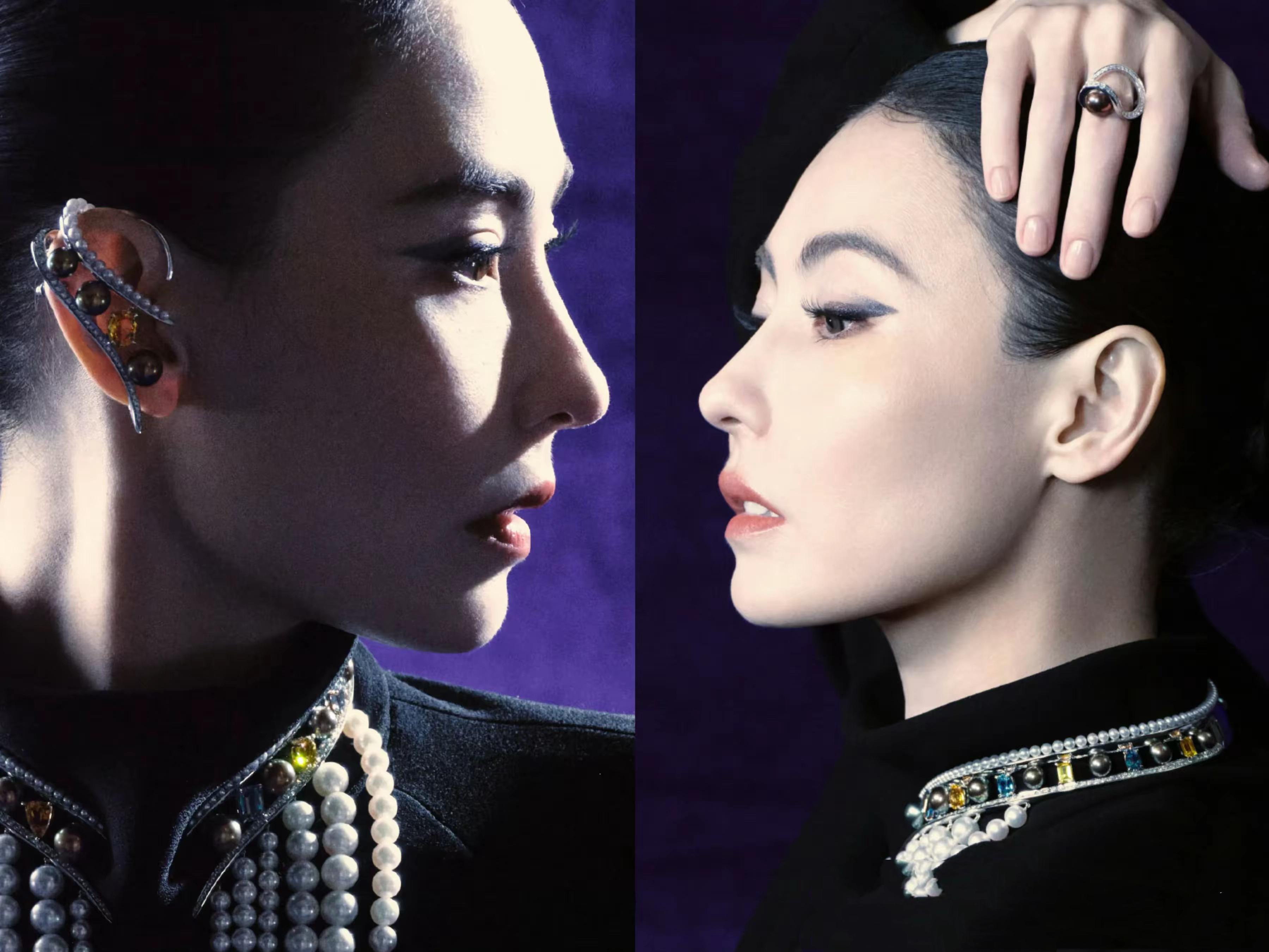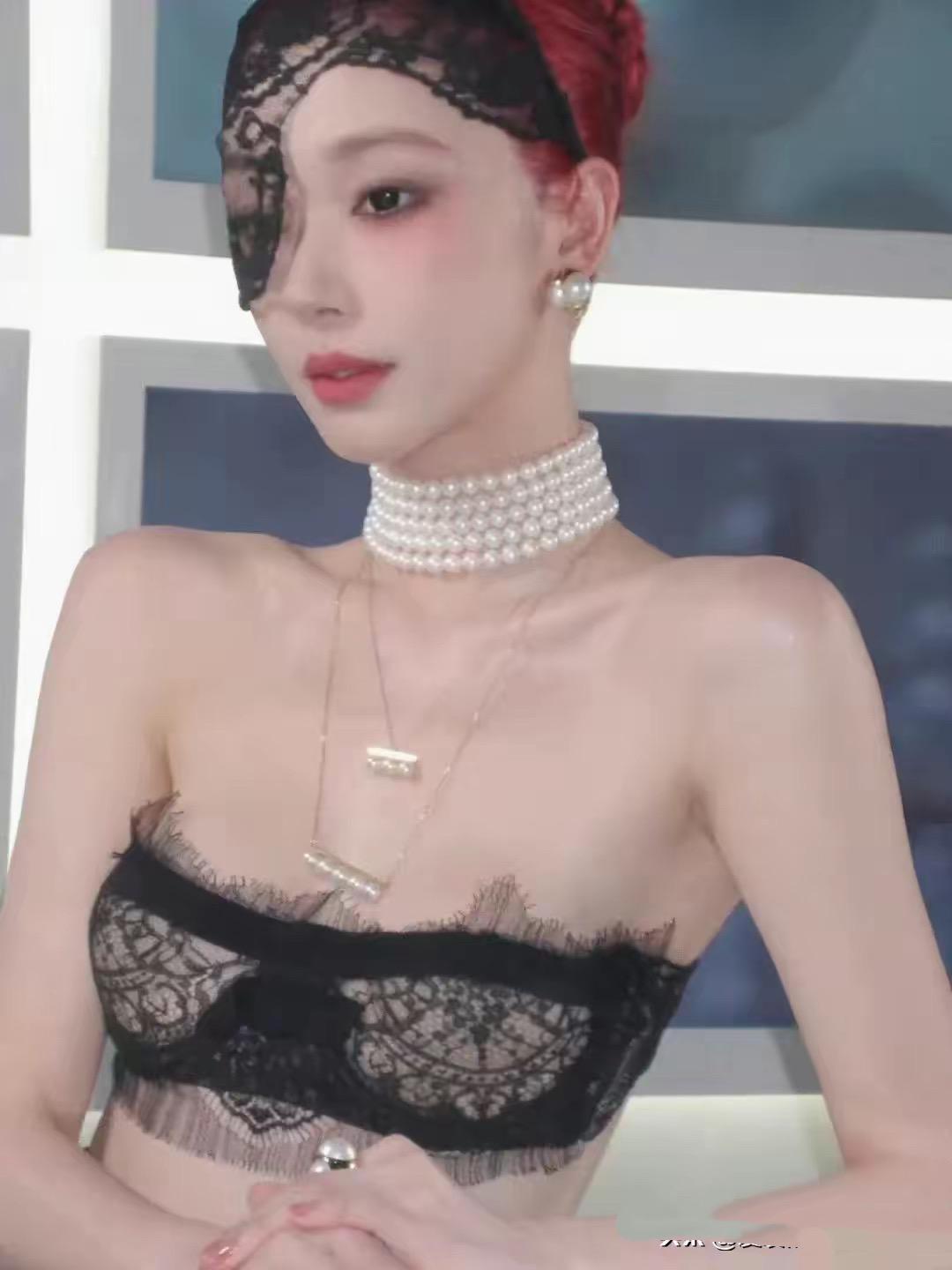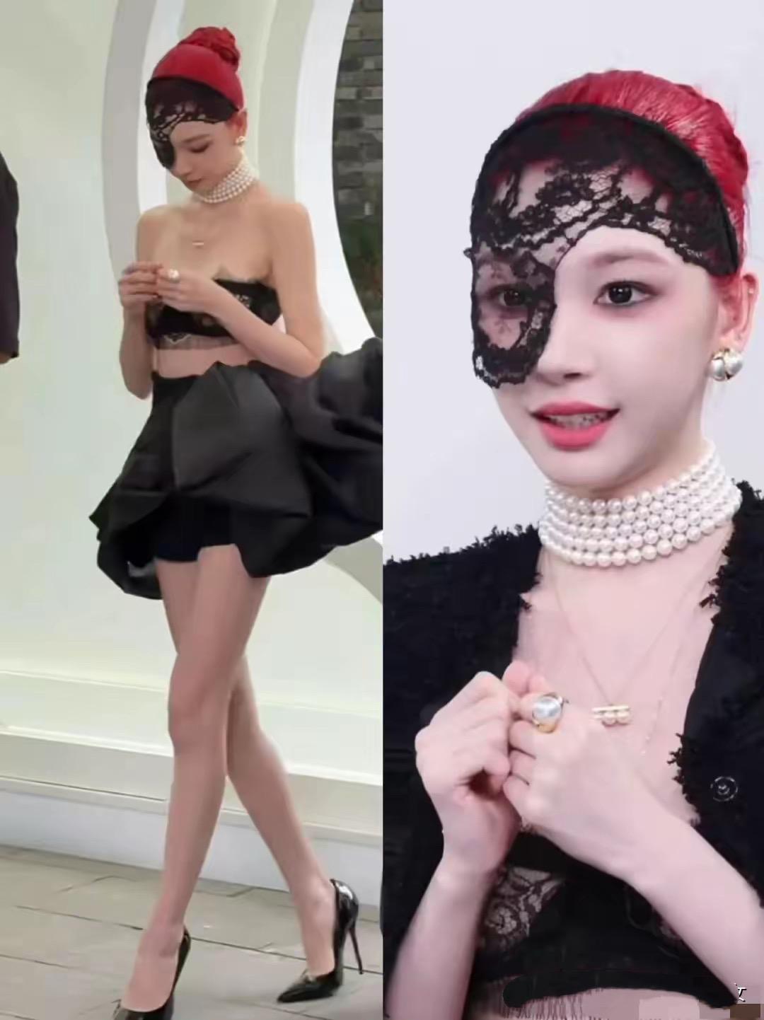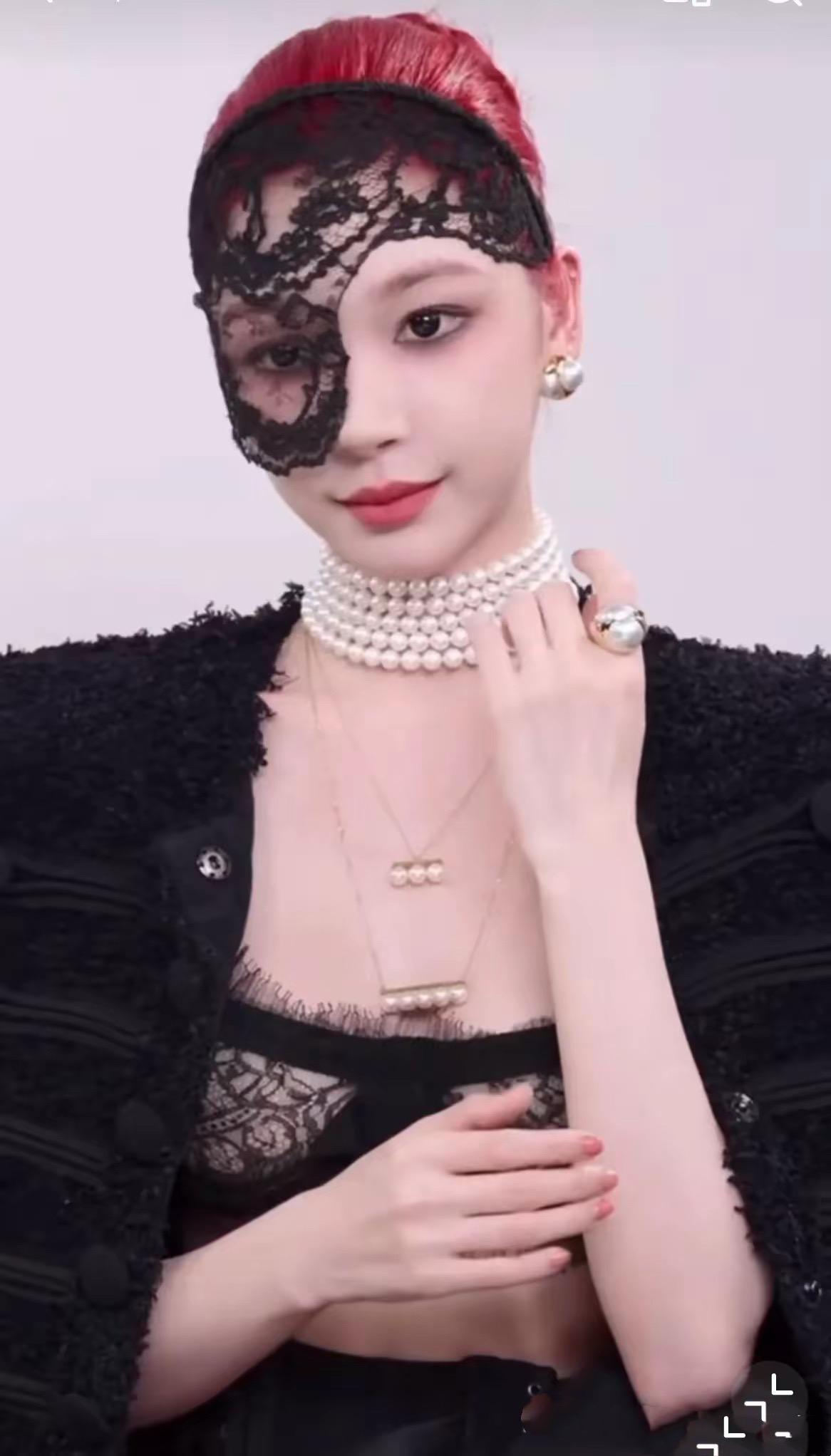 易夢玲也佩戴了好幾圈珍珠項鍊,她染了紅紫色的頭髮、用黑色蕾絲面罩擋住了額頭和眼睛的位置,這種神祕和嫵媚,太讓人心動了。
