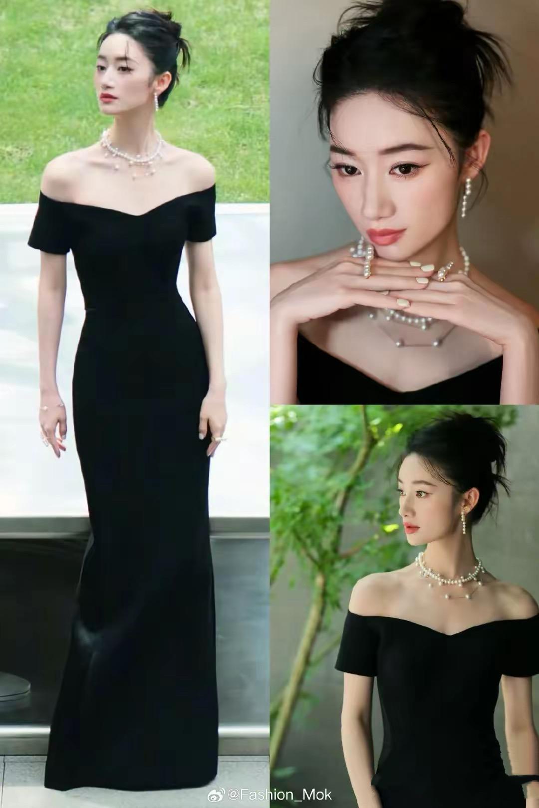 郭曉婷穿着黑色一字肩的長裙,屬於一種比較中規中矩的look,她也嘗試了珍珠的項鍊、耳環,看起來郭曉婷特別瘦,臉上一點肉都沒有。