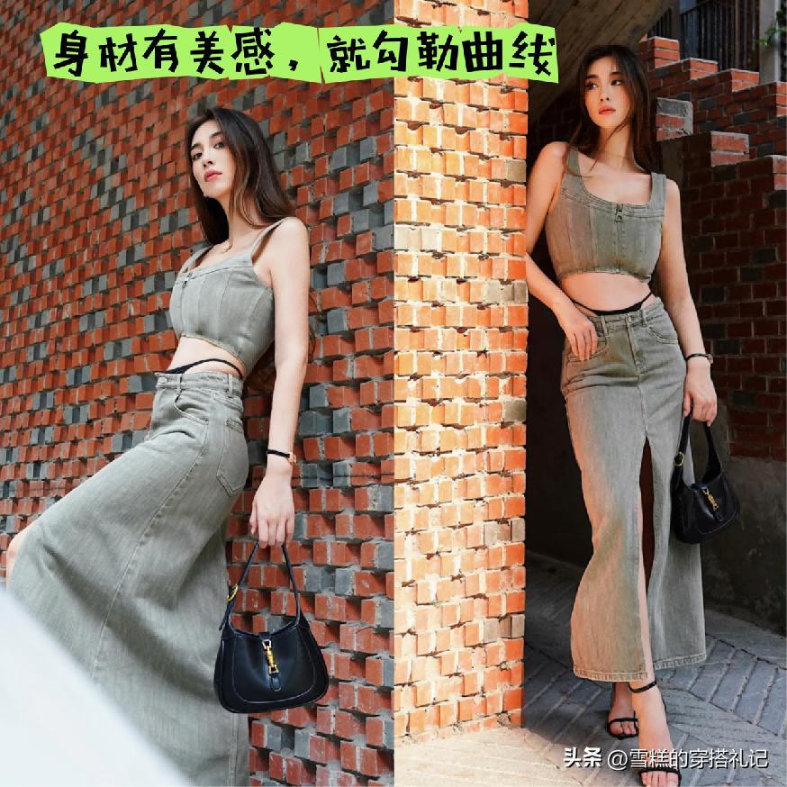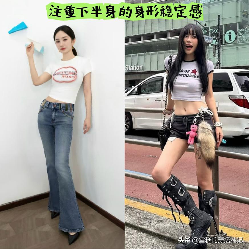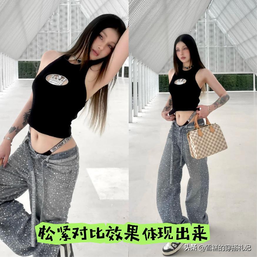 露出來腰身以及胯部這兩個部位的穿搭組合,其實就可以運用短款的上衣,結合長款的低腰褲或者低腰裙的搭配,這樣的穿搭是有着非常明顯上短下長的對比效果,那麼這樣的運用其實會讓我們整個下半身的腿形比例的縱向長度更加顯長一些。