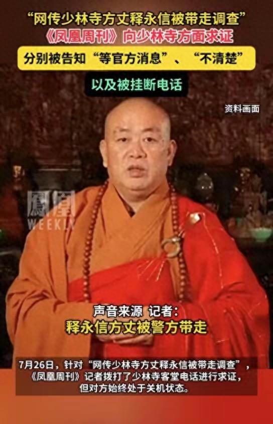 7月26日,就有消息爆料。說少林方丈釋永信被帶走調查了,不過這個消息沒有得到證實,不少媒體記者撥打少林寺客堂電話,對方一直關機狀態,迴避態度非常明顯。