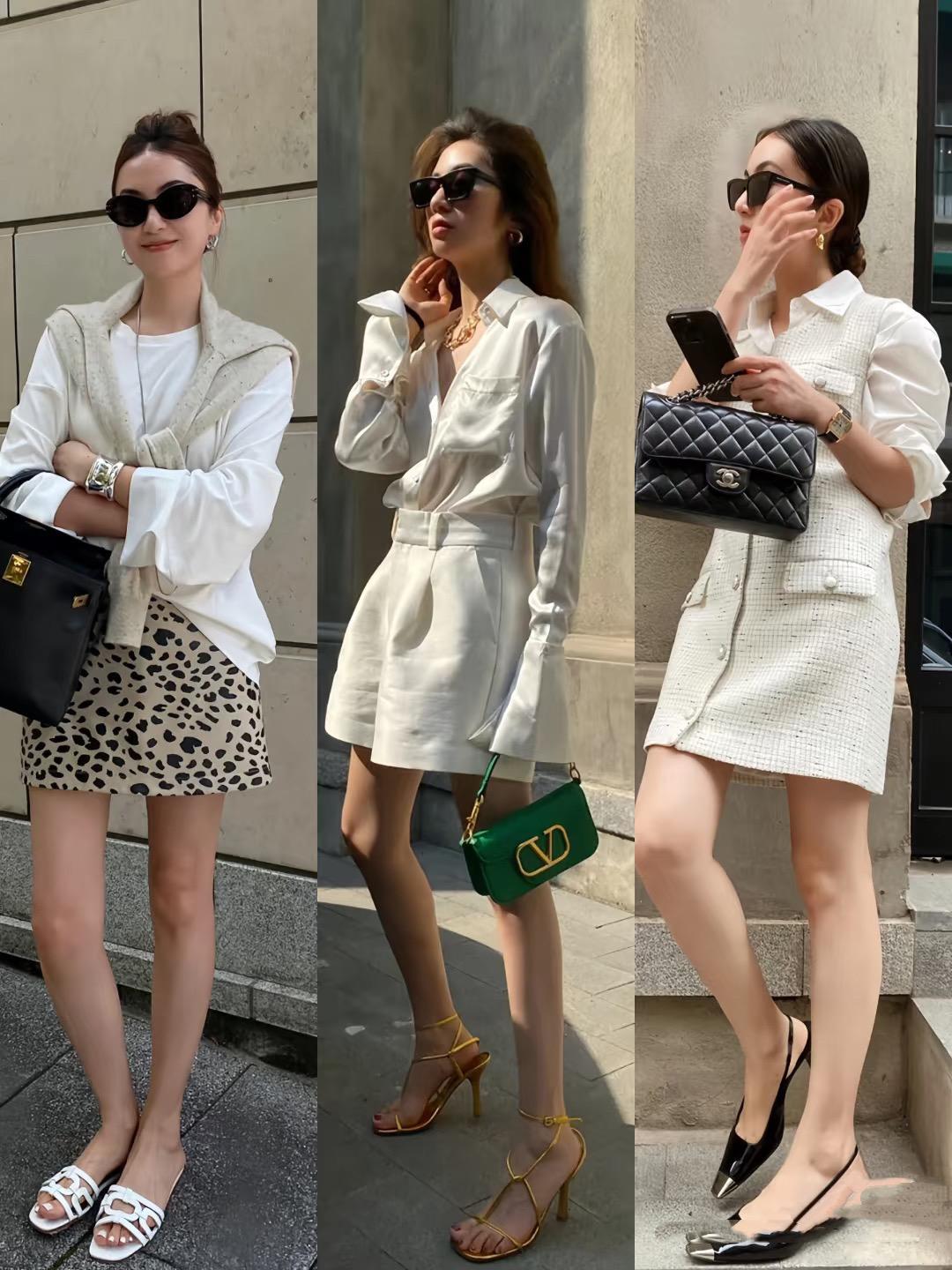 白襯衫+白色短褲,配一雙綁帶的高跟鞋,時髦中帶着颯美。一頭披肩的長髮,溫婉優雅。頸部的項鍊、與鞋子的金色綁帶呼應,才更顯貴氣。