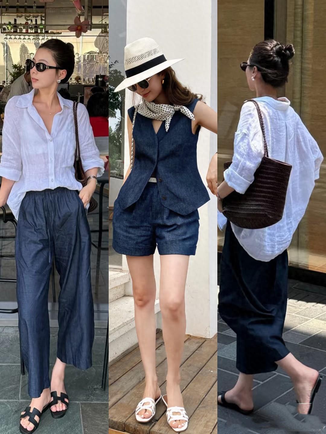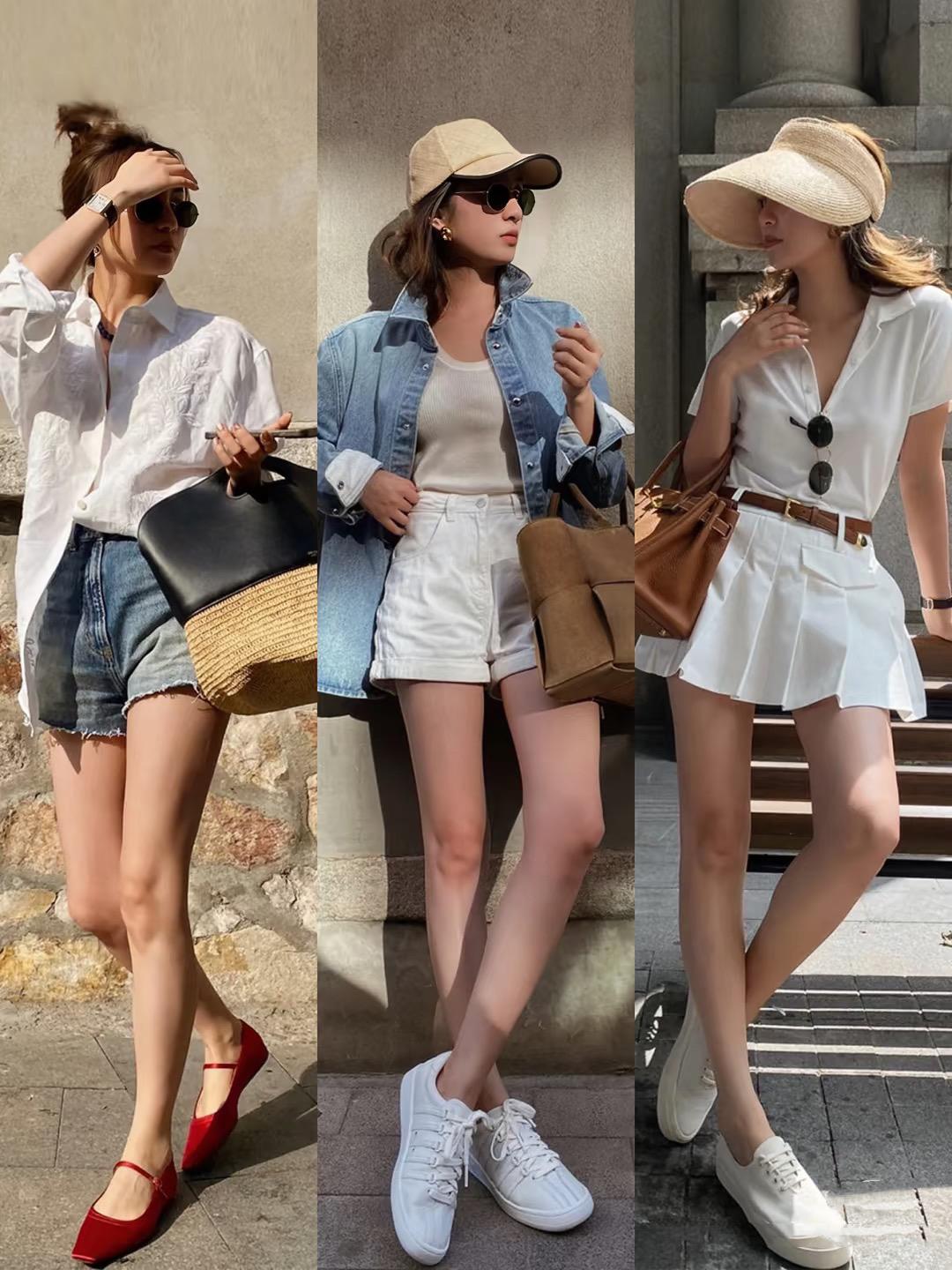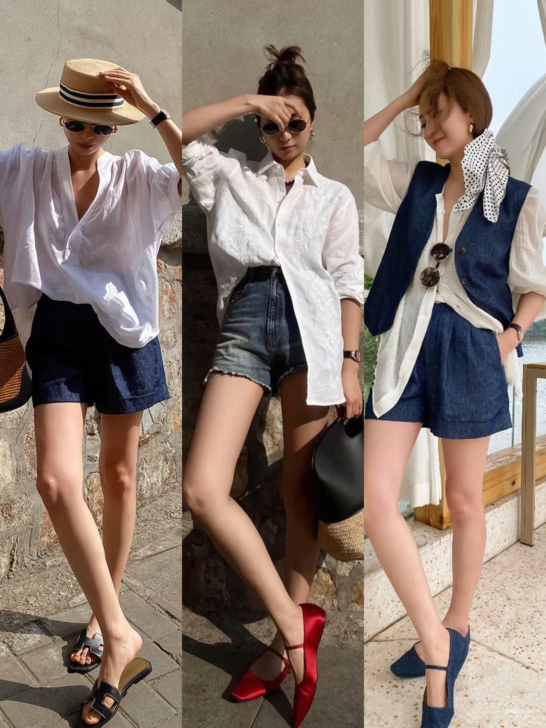 寬鬆的白襯衫、磨邊的牛仔短褲,配上拼接的托特包,這鬆弛感太到位了。夏天不管是出街還是度假,都很洋氣。