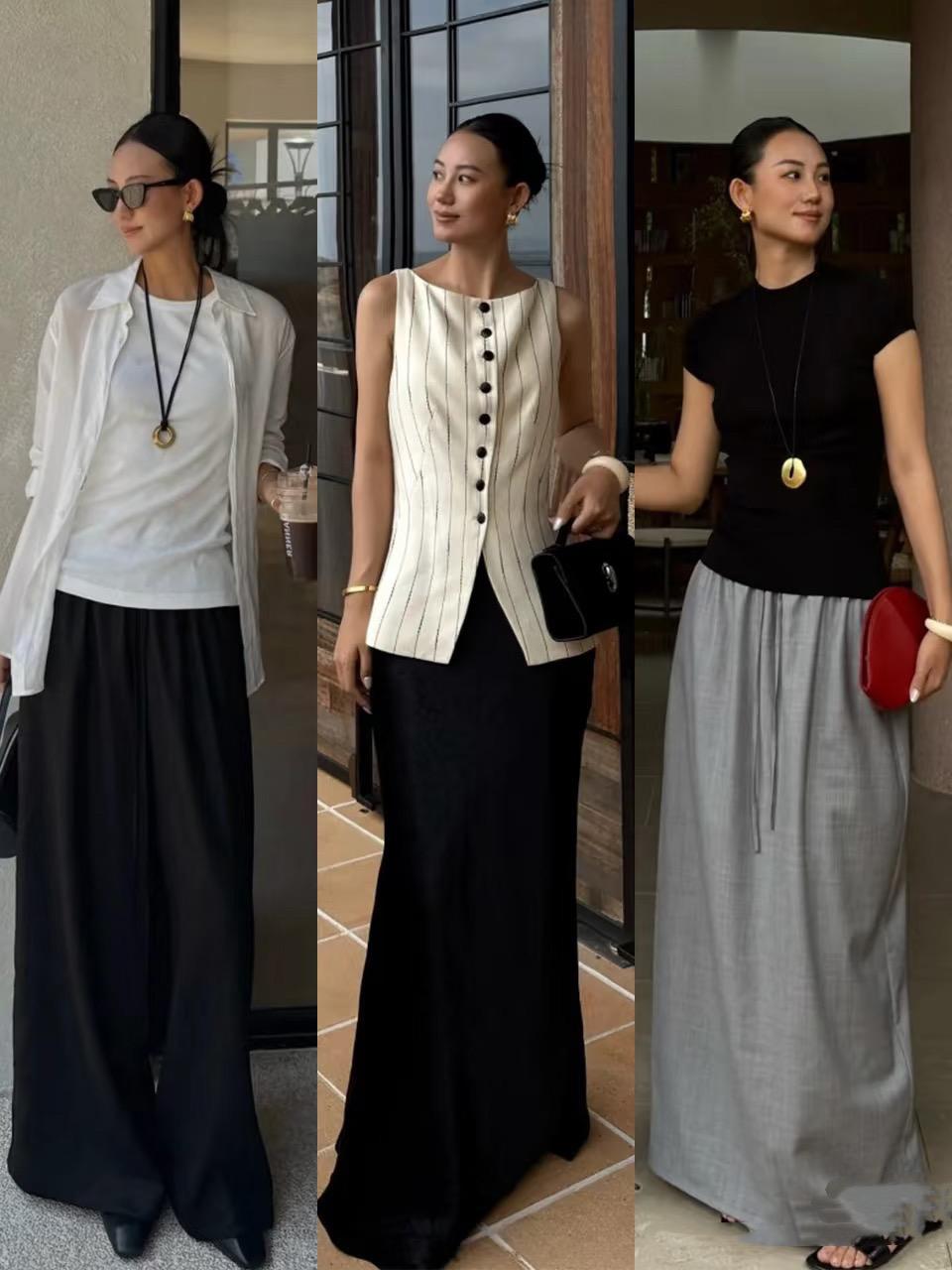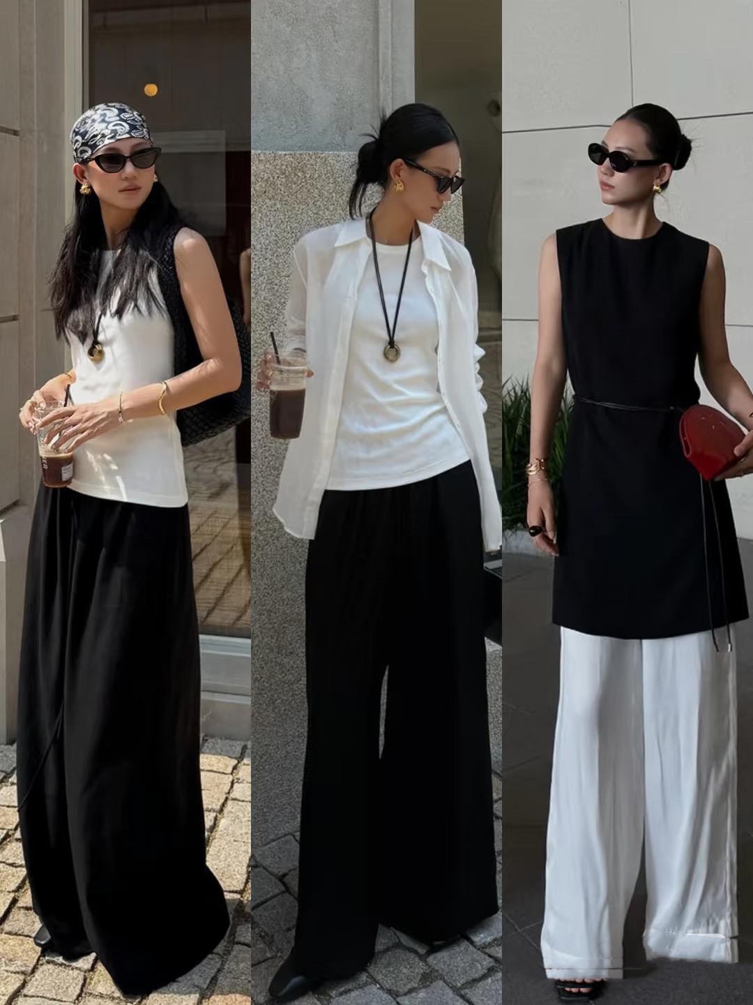夏天裏的修身小背心,和高腰的闊腿褲就非常配。上緊下松的設計,可以更加顯瘦,也可以修飾腰臀部的厚重感。
