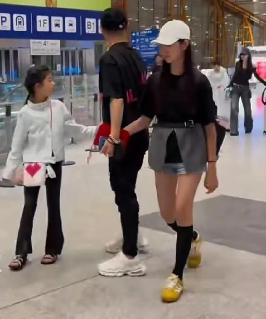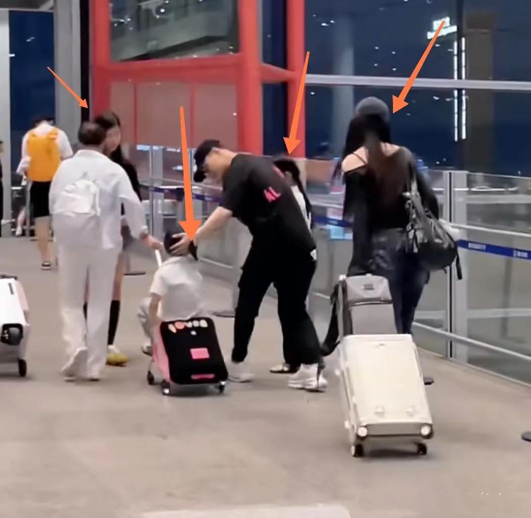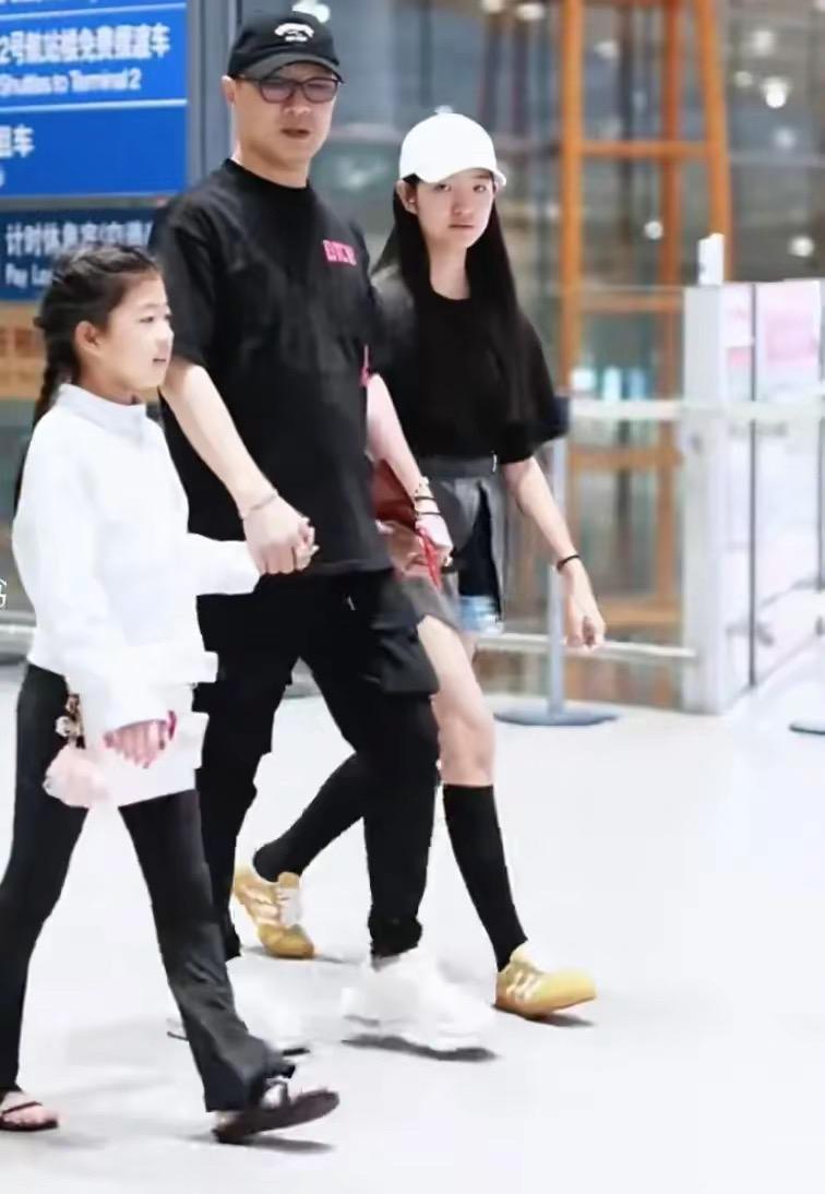工作人員在後面推着行李箱,汪峯一手牽着一個女兒。小女兒就是醒醒、也就是章子怡和汪峯的女兒。