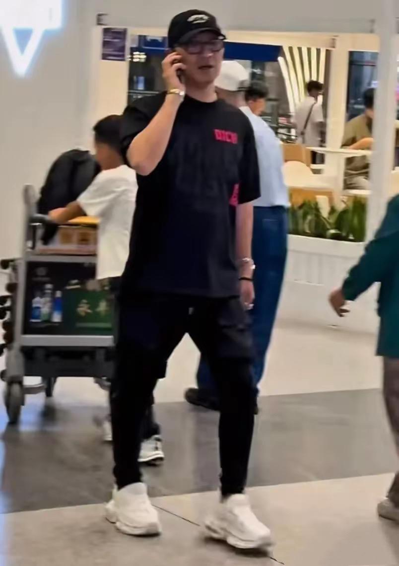 一下飛機,汪峯就忙着打電話,應該是安排人員來接。畢竟“一拖四”實在是太有難度了,汪峯還是穿着一身黑,黑色T恤、蘿蔔褲、運動鞋,萬年不變的半永久造型。