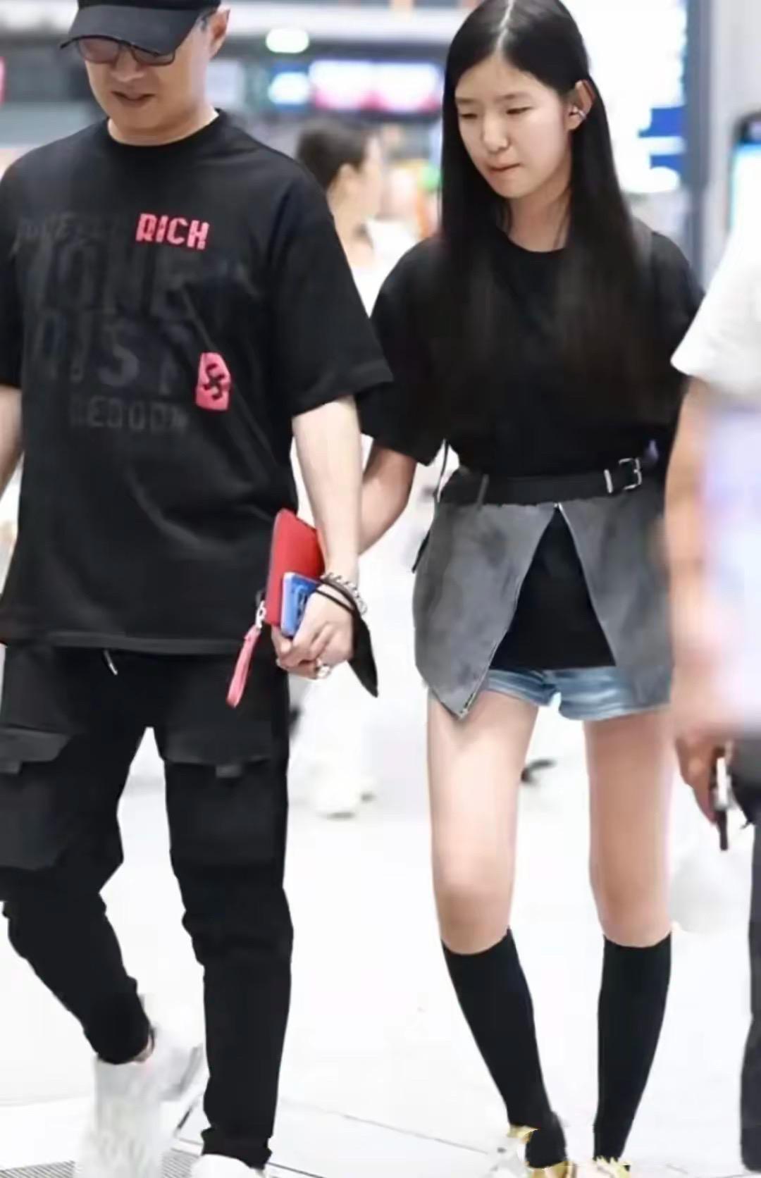 汪峯的二女兒打扮的也很洋氣,黑色T恤、牛仔短褲、小腿襪,還配個個性的裙襬拼接,帶着一頂白色鴨舌帽,臉型有點寬,眉眼和汪峯更像一些。