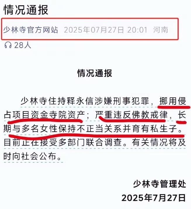 才過了一天,網絡上的輿論壓不住。少林寺官網也給出正式通告,表示少林寺住持釋永信挪用侵佔項目資金寺院資產,長期與多名女性保持不正當關係並育有私生子,目前正在接受多部門聯合調查,有關情況會及時向社會公佈。