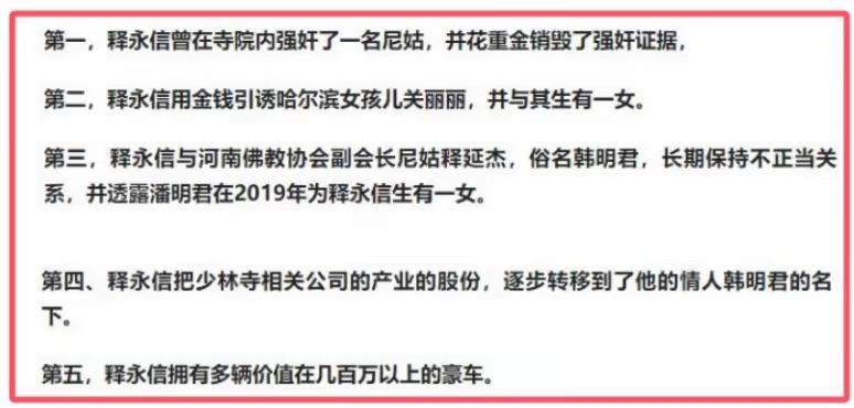 其中涉及了和尼姑的不正當關係、育有私生子女、佔用少林資產的事情。