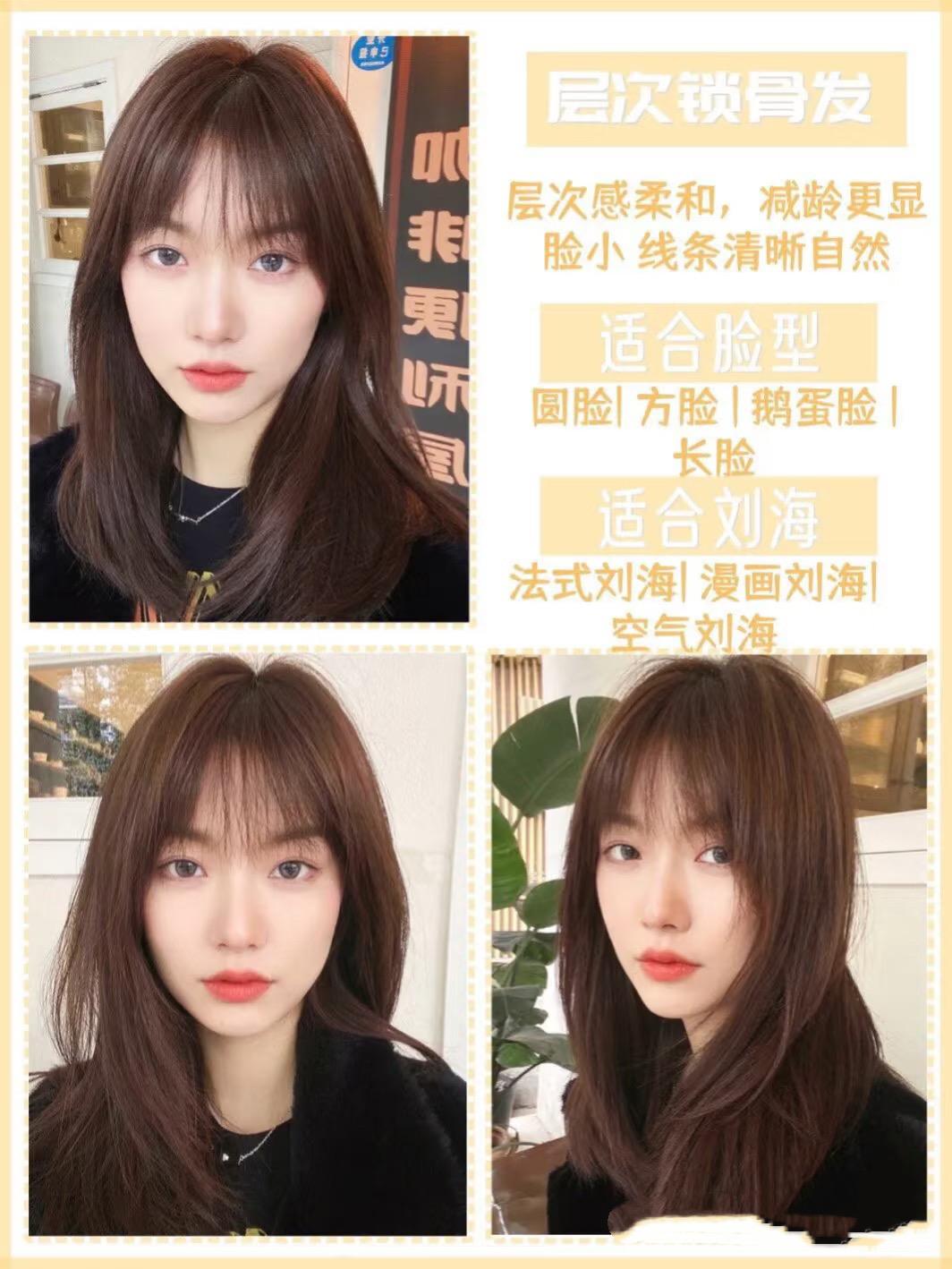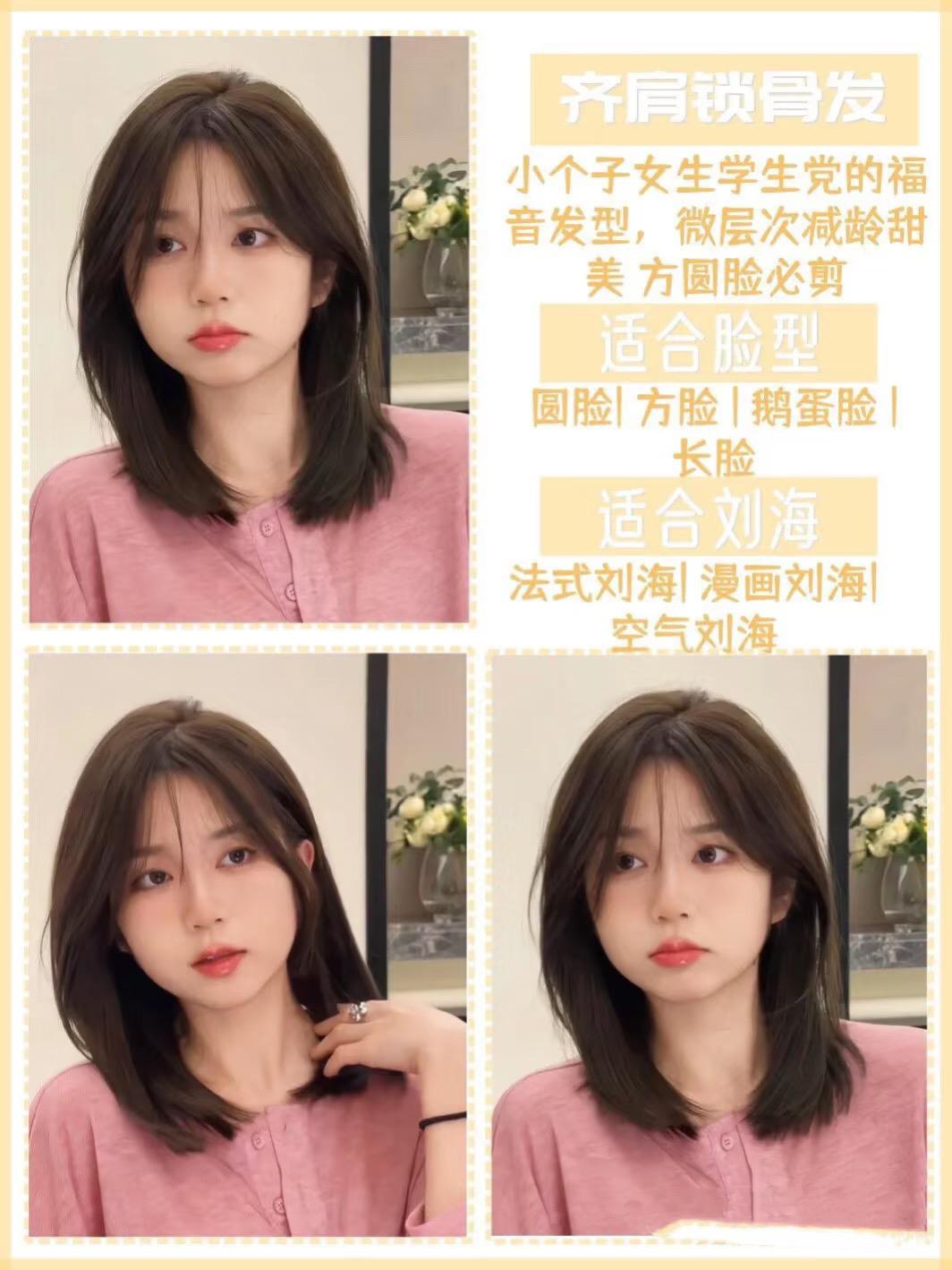 齊肩鎖骨發,如果你的頭髮沒有那麼長,可以嘗試這種很好打理的鎖骨發。鎖骨發屬於一種比較減齡的髮型,適合方圓臉、很可愛,也適合小個子。