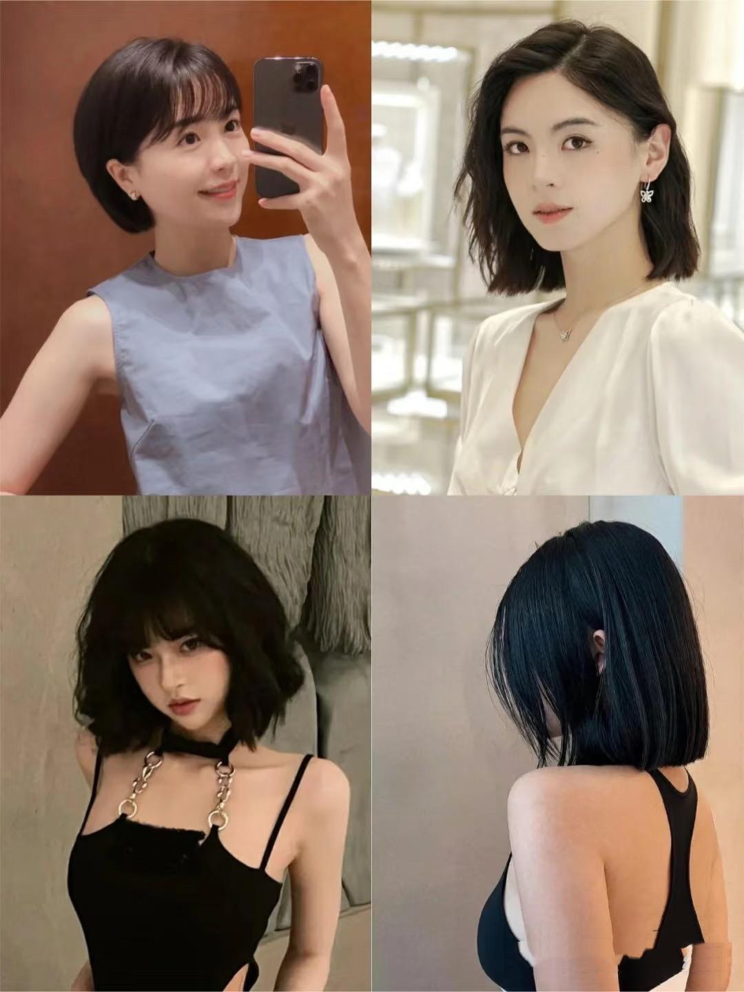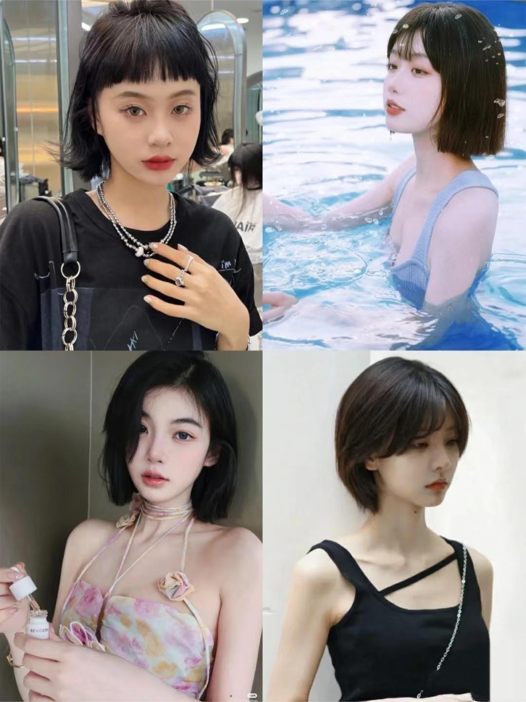 如果喜歡相對大方時尚一些,還是可以嘗試齊肩發、一刀切活着層次感短髮都不錯。因爲夏天衣服輕薄,短髮的造型也很大颯美,不會嫌多油膩。