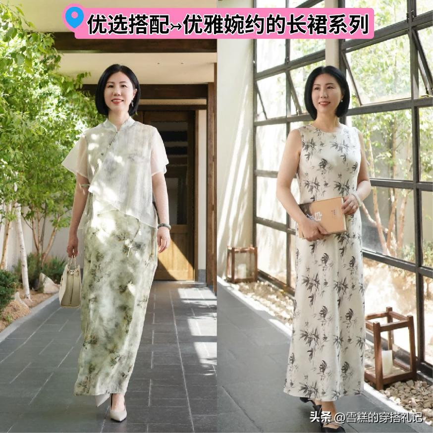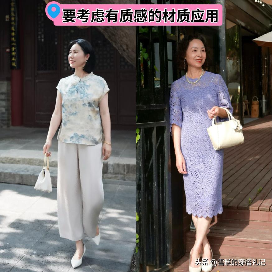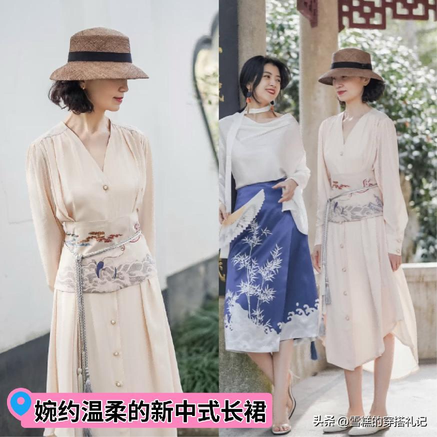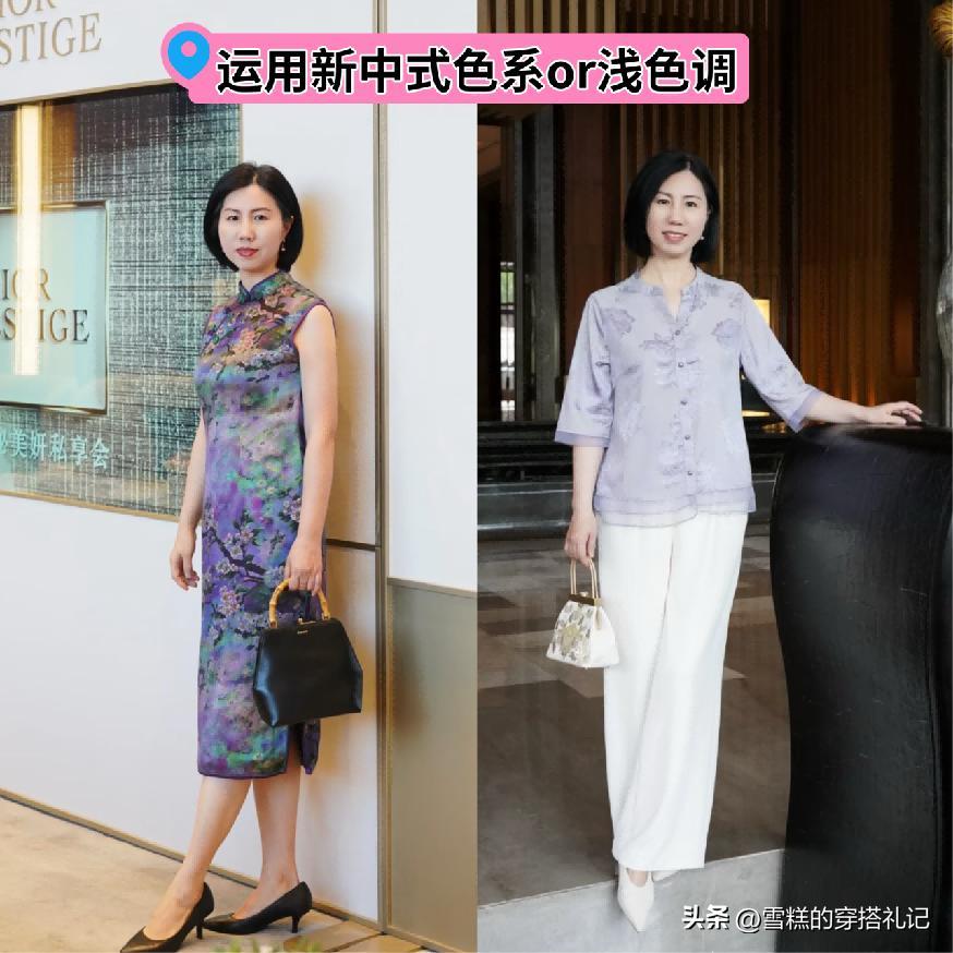 於各位女性而言,上了年紀想要優選運用新中式的搭配存在,就最好還是可以考慮長款的裙裝搭配系列哦,視覺上體現出來的優雅和婉約的韻味兒會更足一些,且裙裝也要搭配漏出腳踝的長度,在視覺上的體現效果會更透氣好看,有比例優勢。