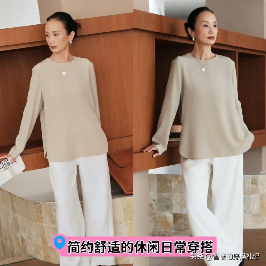 到了五六十歲的年級階段的時候,就可以多多的優選考慮更呈現優雅溫柔感比較明確的單品組合啦,不用那麼強調絕對的優雅感,更多一些鬆弛自然的溫柔是很重要的,所以三木媽媽這一套更具有好氣質的組合搭配,就趕快將其運用起來吧!