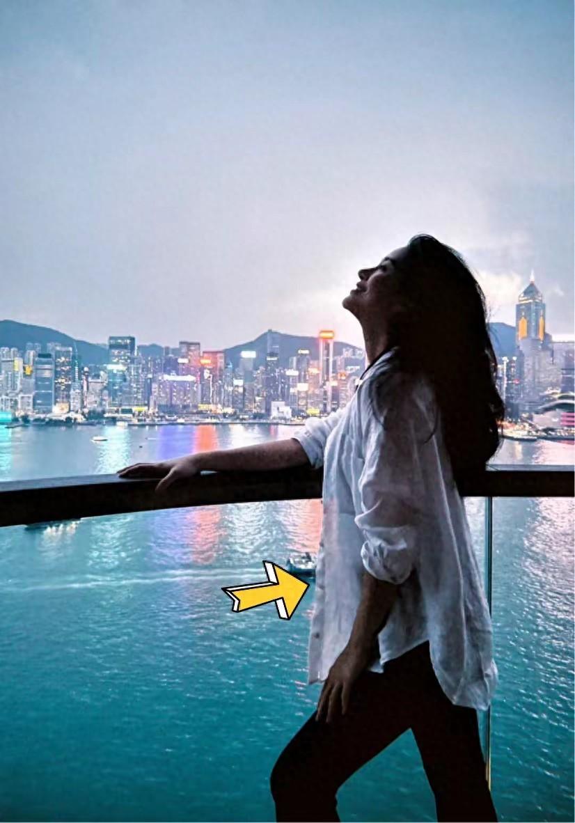 當天楊採鈺穿了一件寬鬆的白襯衫,配了黑色的瑜伽褲。在美麗的夜景下拍照。她微微揚起頭,露出甜甜的笑,頭髮微卷、朦朧而神祕。