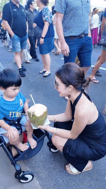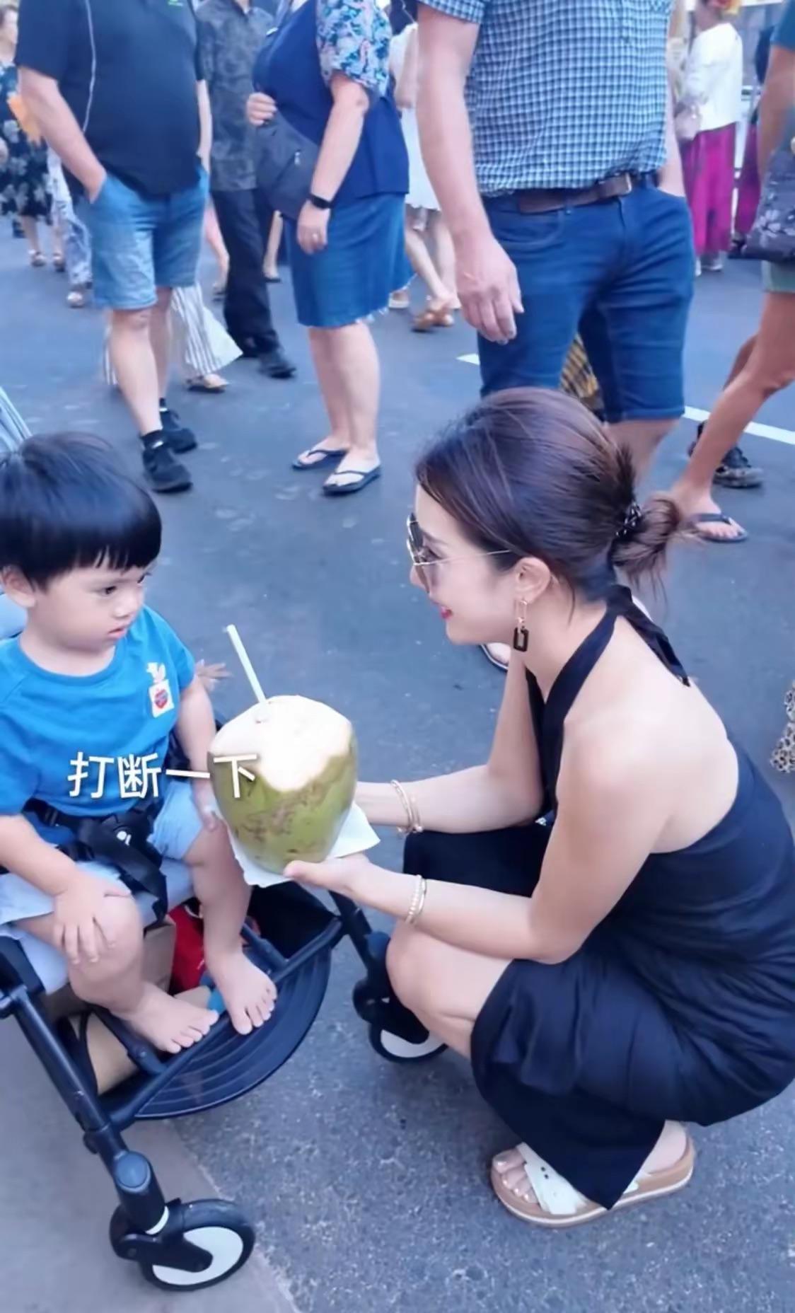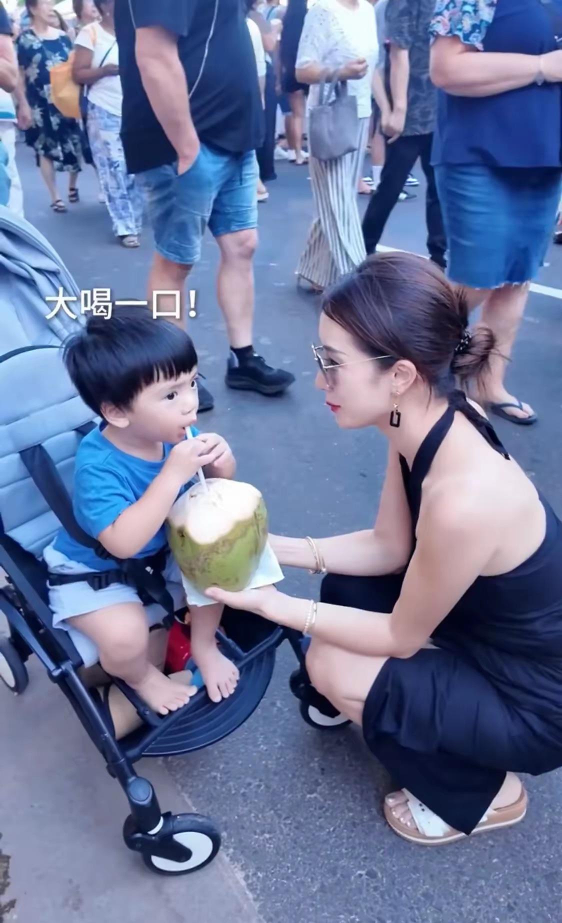 李念蹲下來給兒子喝椰子汁,小兒子也很享受這種天然的飲品。她的小推車裏還放了遮陽帽、水杯、遮陽傘、紙巾、溼巾等等。