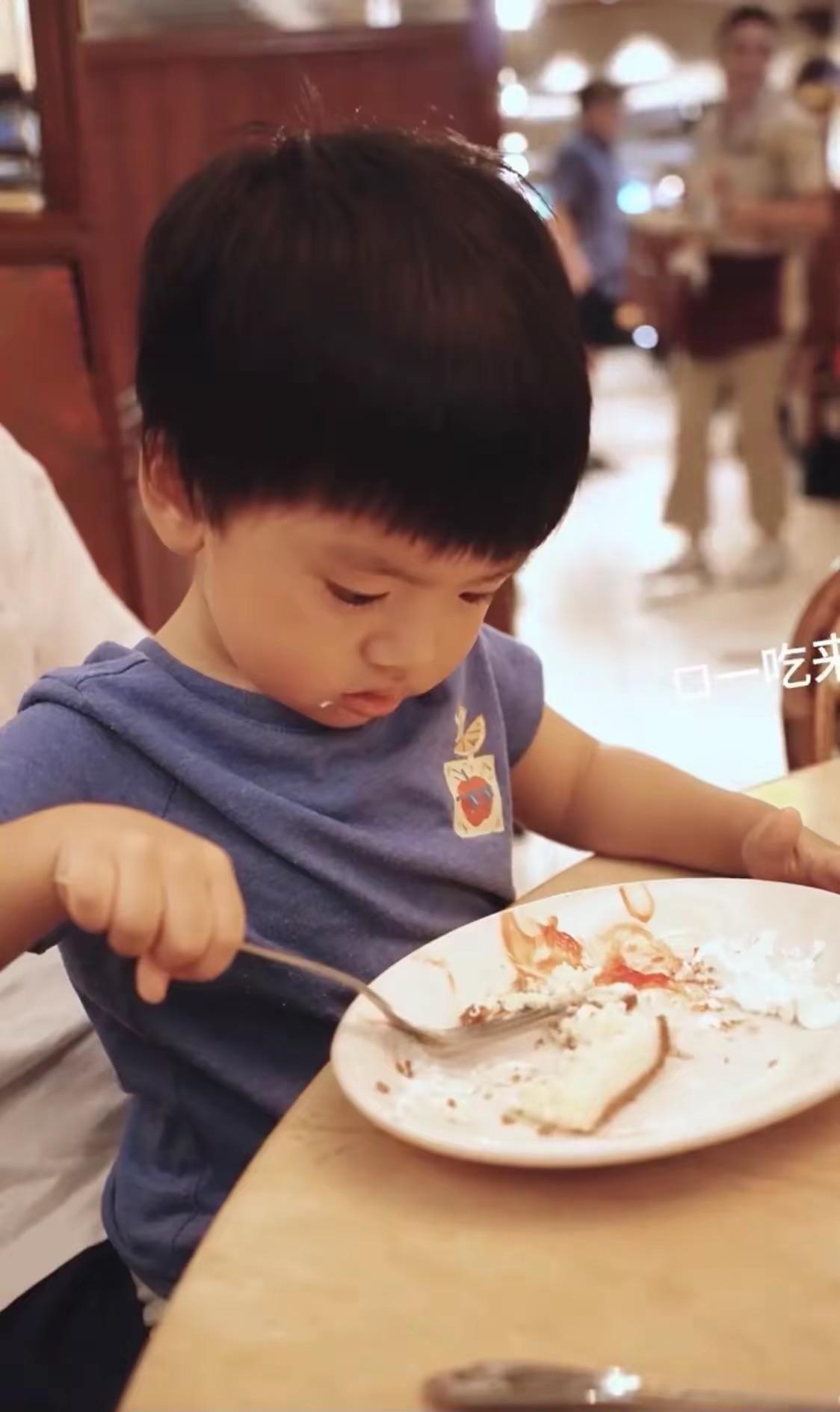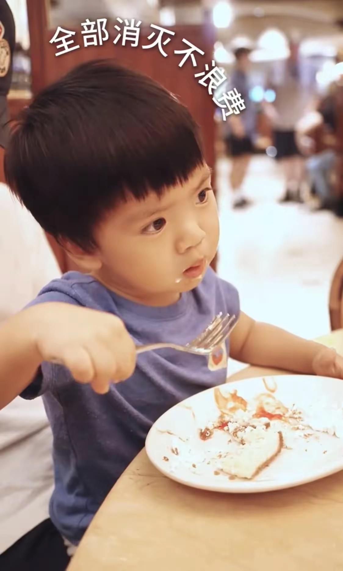 大眼睛、雙眼皮、高挺的鼻樑,這個小兒子看起來太俊俏了。他自己拿着叉子喫飯,完全不需要李念幫忙,一個人把自己的盤中的食物全部消滅掉了,是個不挑食的小夥子。