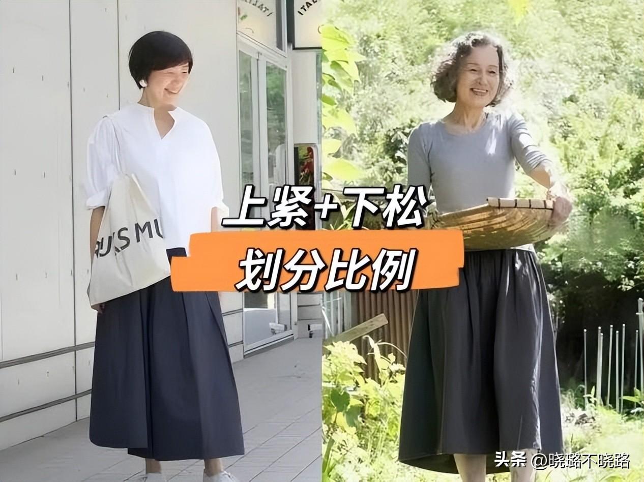 當你的上衣和下裝都穿的太寬鬆臃腫的時候,很容易視覺上造成膨脹的感覺,分外顯胖顯肉多,還不如結合自己的身形特點,做好寬窄配合,如果你的肩膀比較窄,那麼完全可以穿稍微修身,帶一些露肩小設計的短袖,配上裙襬略微寬鬆一些的傘裙或者直筒裙,用上緊下松的組合,豐富全身的造型,輕鬆get日本主婦的優雅迷人。