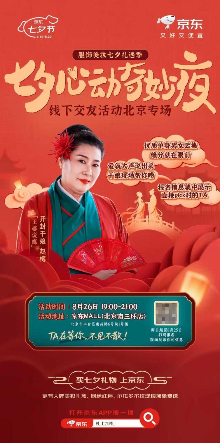 8月26日19:00,京東服飾美妝還聯合京東MALL,將攜手網絡爆火的開封交友欄目《王婆說媒》主持人趙梅,在京東MALL北京南三環店打造“心動奇妙夜”線下交友專場,助力廣大單身青年邂逅佳偶良緣。