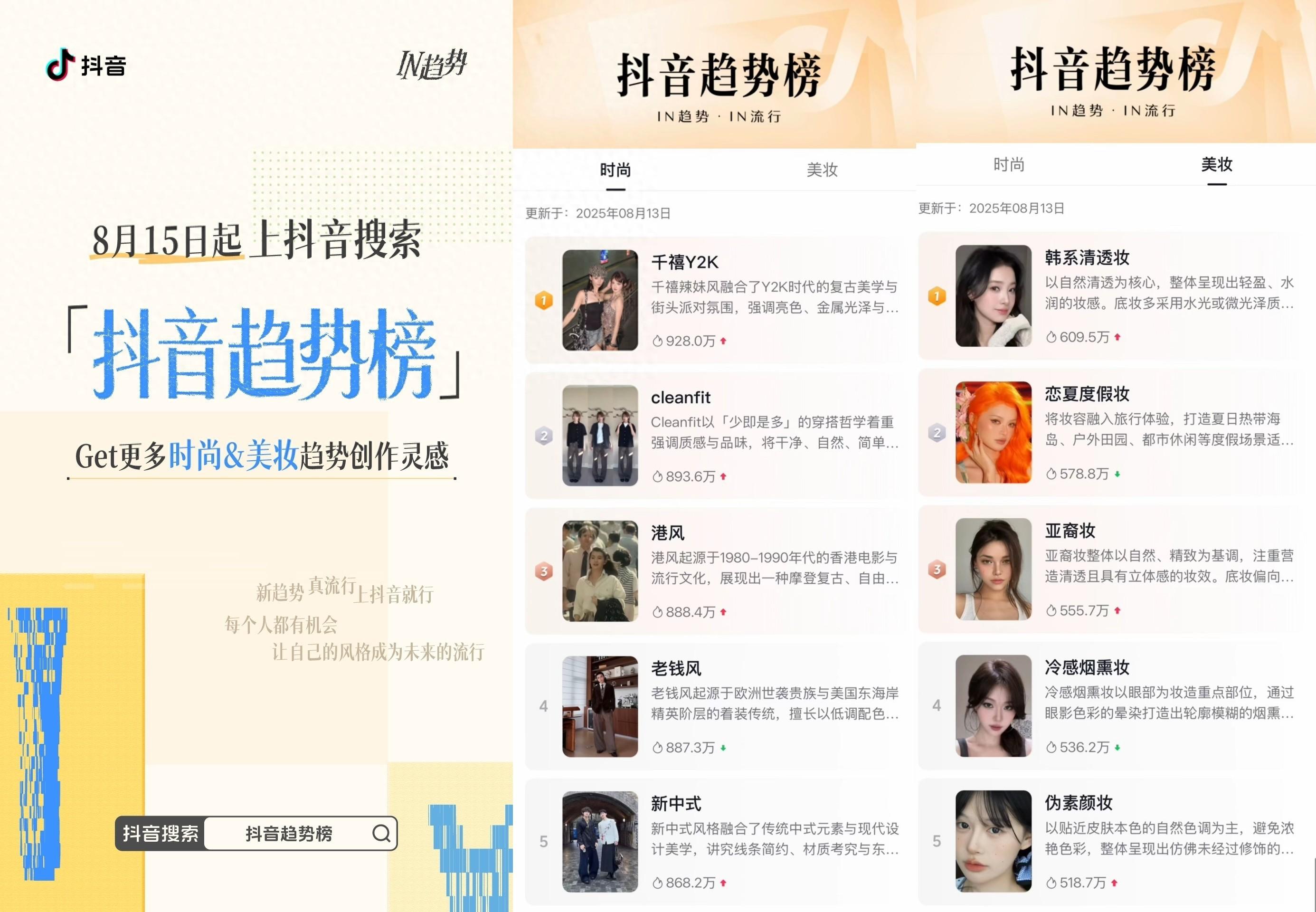 8月,抖音上線了「抖音趨勢榜」,以“IN趨勢”爲主題聚焦平臺上受歡迎的時尚、美妝風格。(可搜索“抖音趨勢榜”查看,本次榜單參考週期爲2025年上半年)
