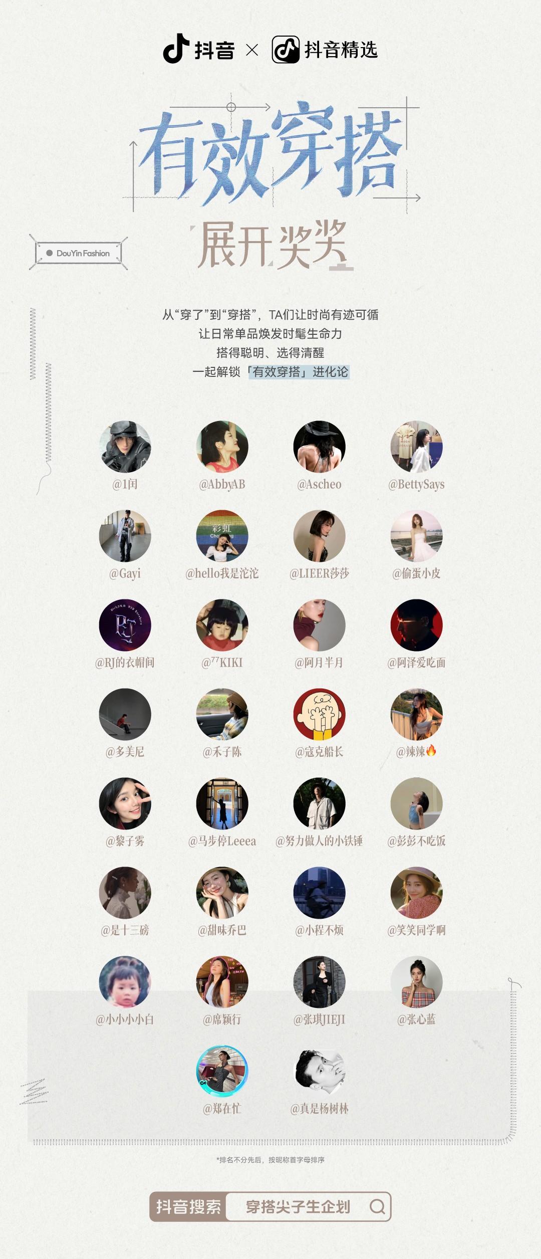 抖音&抖音精選還爲那些在過去一段時間裏致力於探索有效穿搭,帶更多人“搭得聰明,選得清醒”的時尚創作者們頒發了「有效穿搭」獎,期待更多熱愛時尚的靈魂加入這場曠日持久的時尚狂歡,一起解鎖“有效穿搭”進化論!