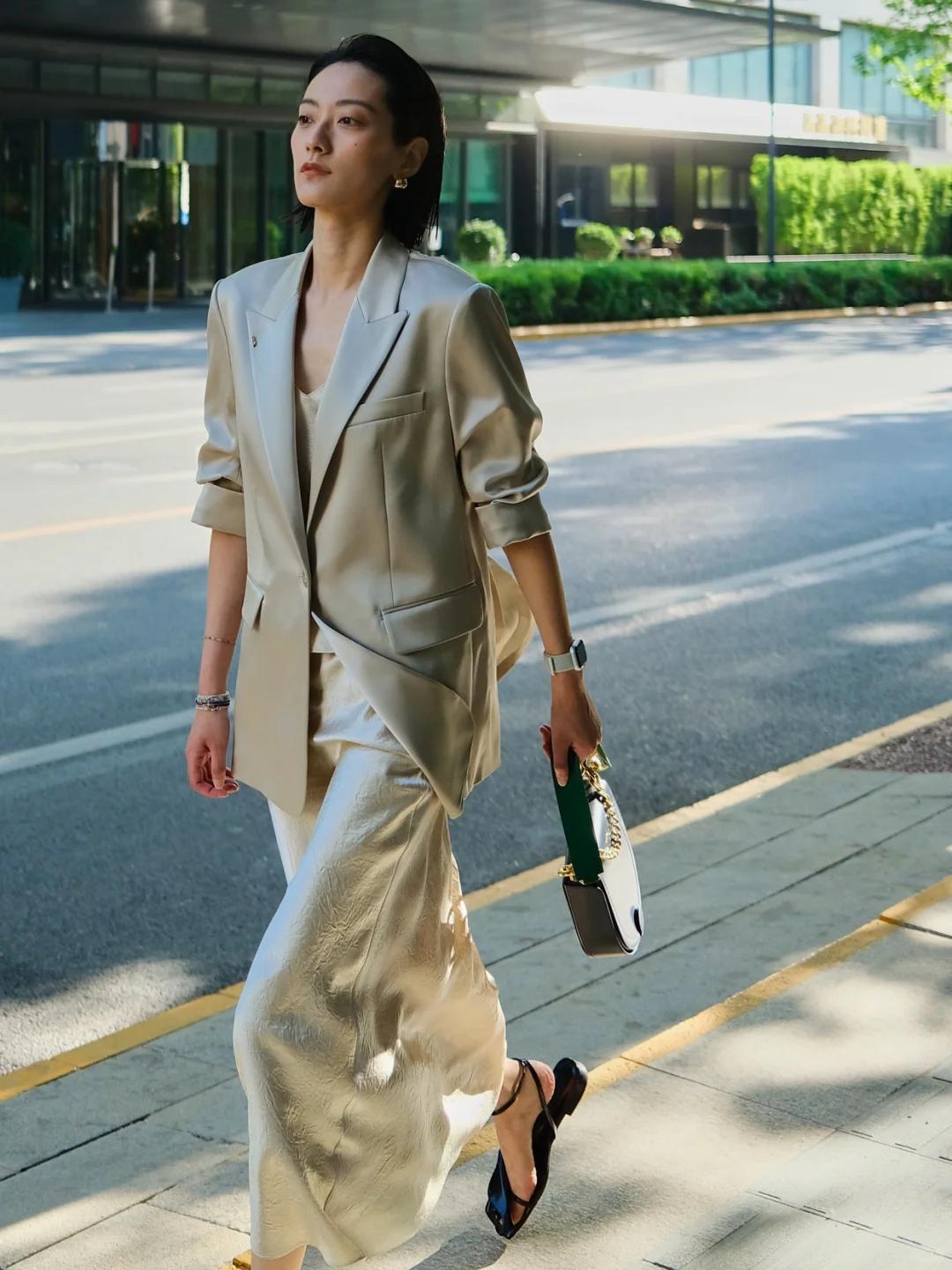 在正式場合穿着 X 版型西裝,搭配連衣裙或者半身裙,再配上精緻的配飾,優雅氣質瞬間拉滿。不過,這種版型對身材要求比較高,身材不夠完美的姐妹可能穿着會有些壓力,需要多嘗試找到適合自己的尺碼和款式哦。